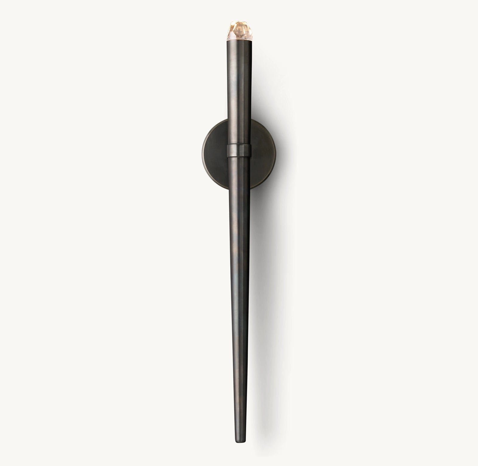 • La finition bronze est un laiton massif naturel qui fonce et se patine naturellement avec le temps. Une fine couche de cire protège la finition et lui permet de vieillir avec grâce pour une patine plus foncée. La finition foncera plus rapidement aux endroits où le luminaire est manipulé ; le port de gants est recommandé