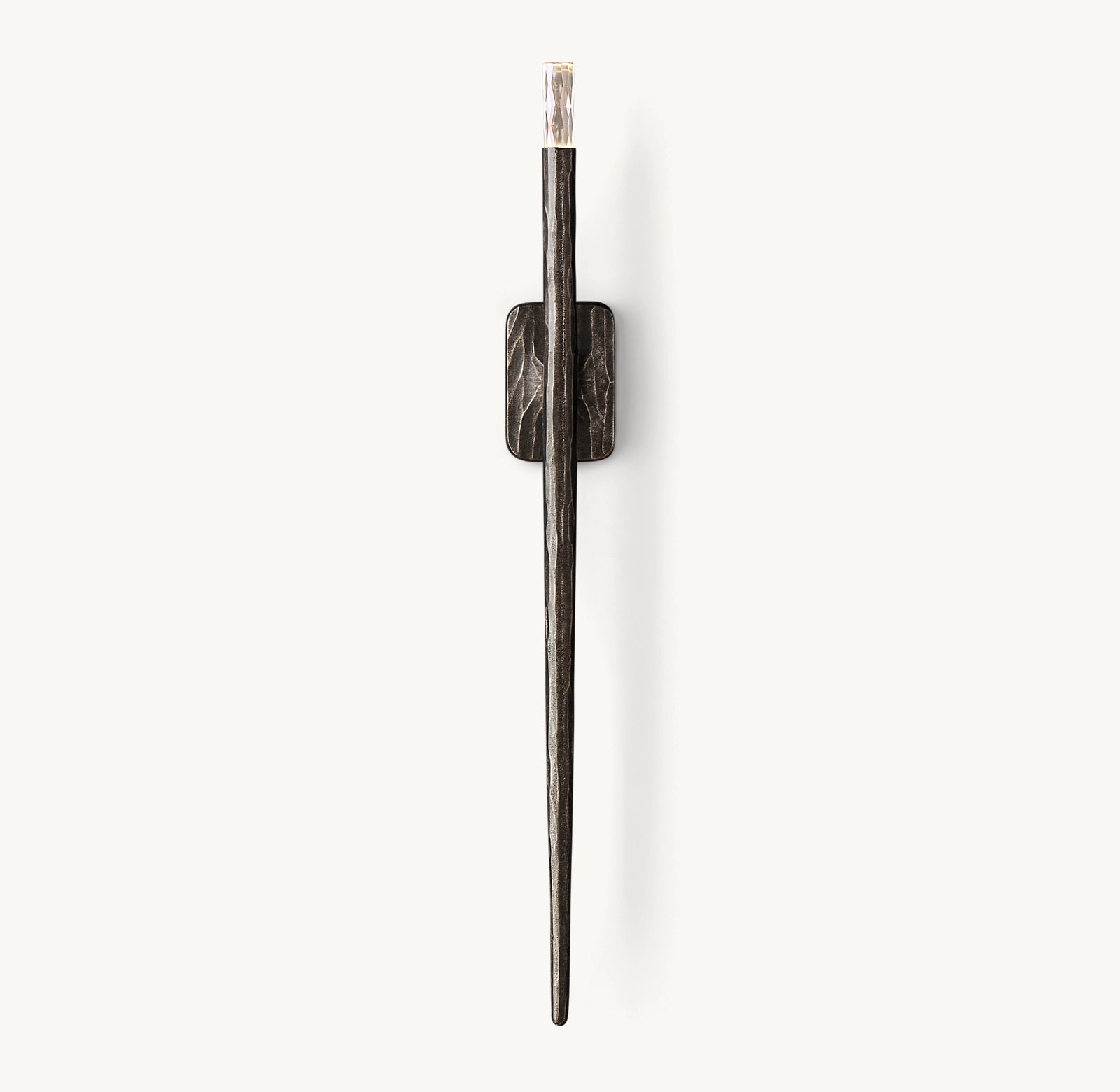 • Un couvercle d'ampoule en verre coulé à facettes fait écho à la texture du métal