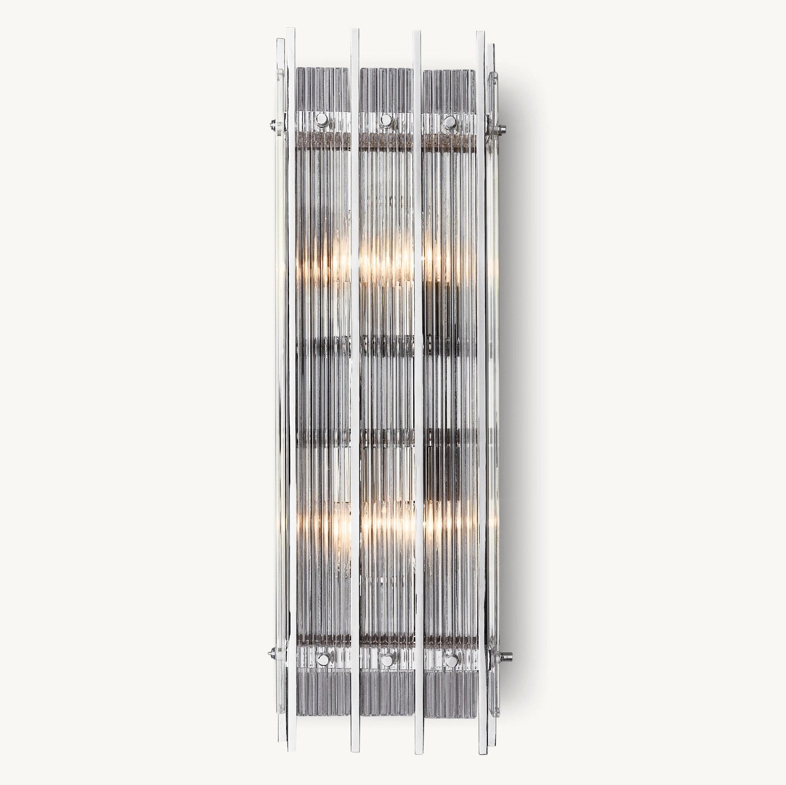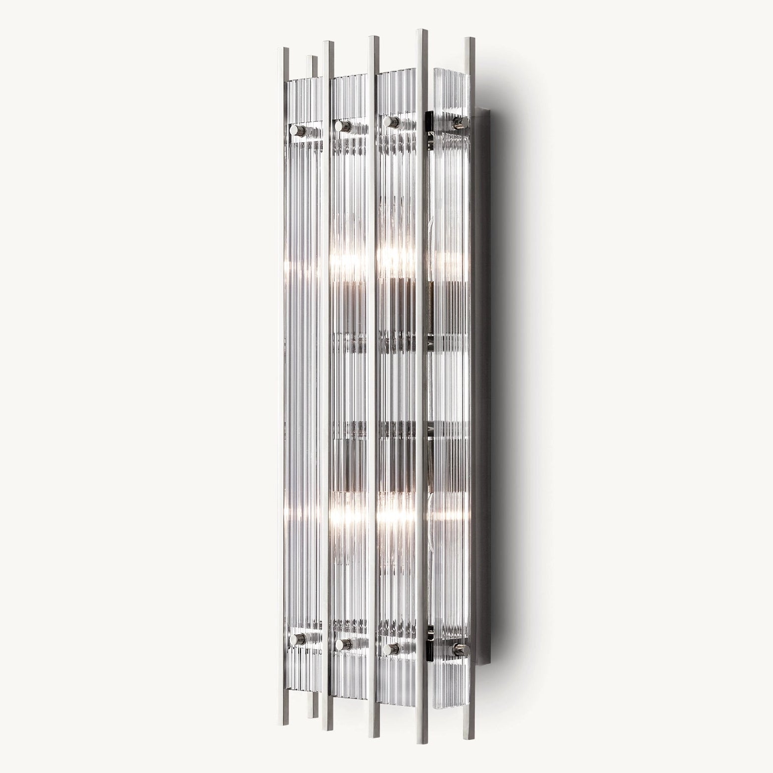 S'inspirant de l'élégance intemporelle des luminaires en verre italiens des années 1960, cette applique murale incarne le raffinement et la sophistication. Son cadre métallique accueille des dizaines de panneaux de verre, minutieusement ciselés à la main pour créer une texture cannelée.