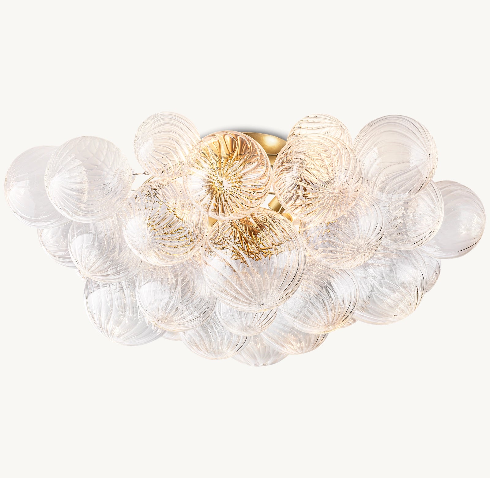 Avec ses 33 globes en verre soufflé artisanal, Éther défie la gravité. Enveloppant une structure métallique sobre, ces sphères tourbillonnantes captent la lumière et la diffractent avec subtilité, créant une texture visuelle riche, mouvante et résolument moderne.