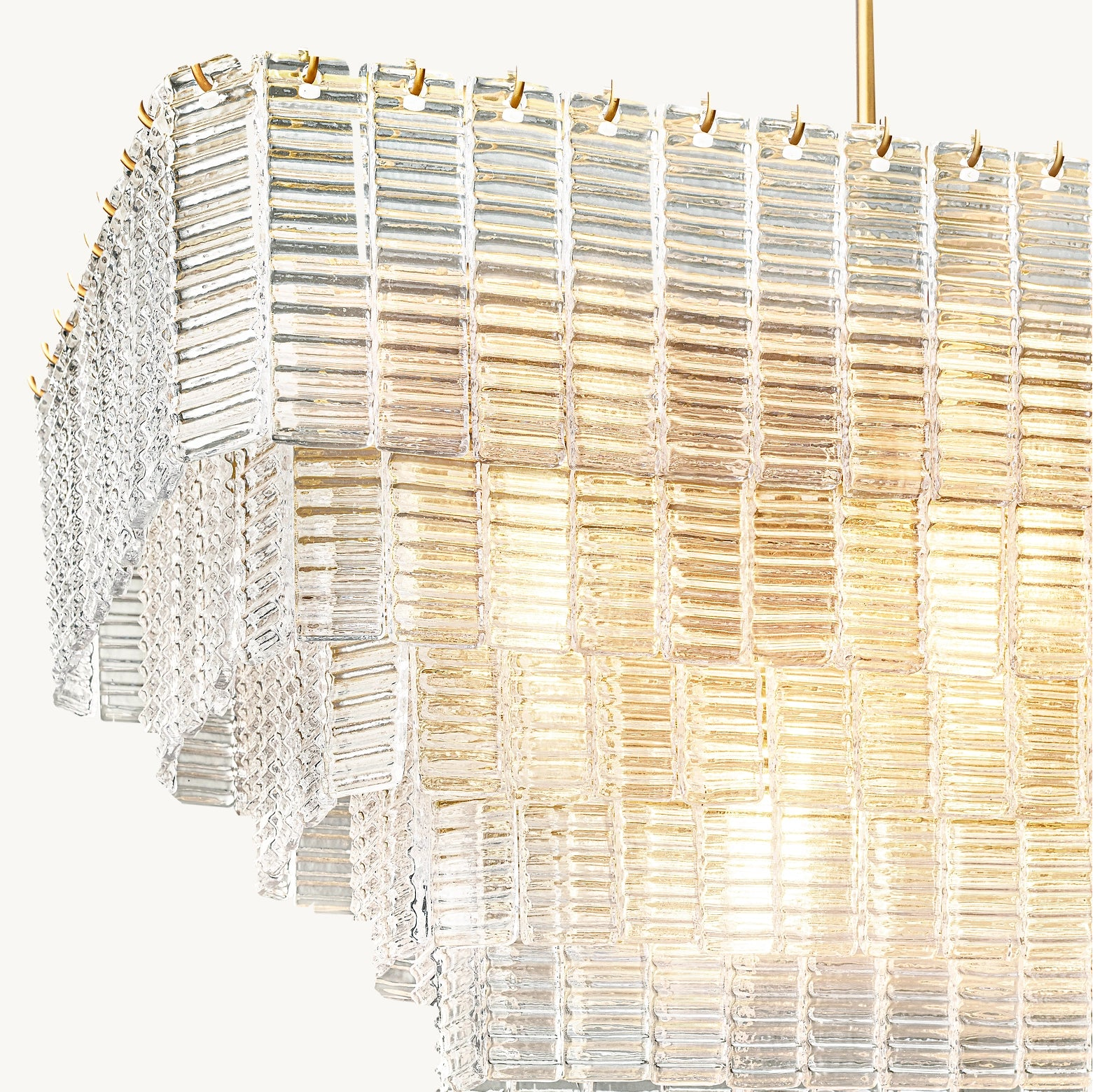 Hommage au design vénitien des années 1950, ce lustre d’exception puise son inspiration dans l’art verrier de Murano. Il marie avec élégance la tradition artisanale au raffinement moderniste. Véritable sculpture lumineuse, il se compose de rubans de verre coulé texturé, disposés en cascade dans une harmonie d’anneaux concentriques. Sa lumière douce et enveloppante sublime l’espace et crée un impact visuel saisissant.