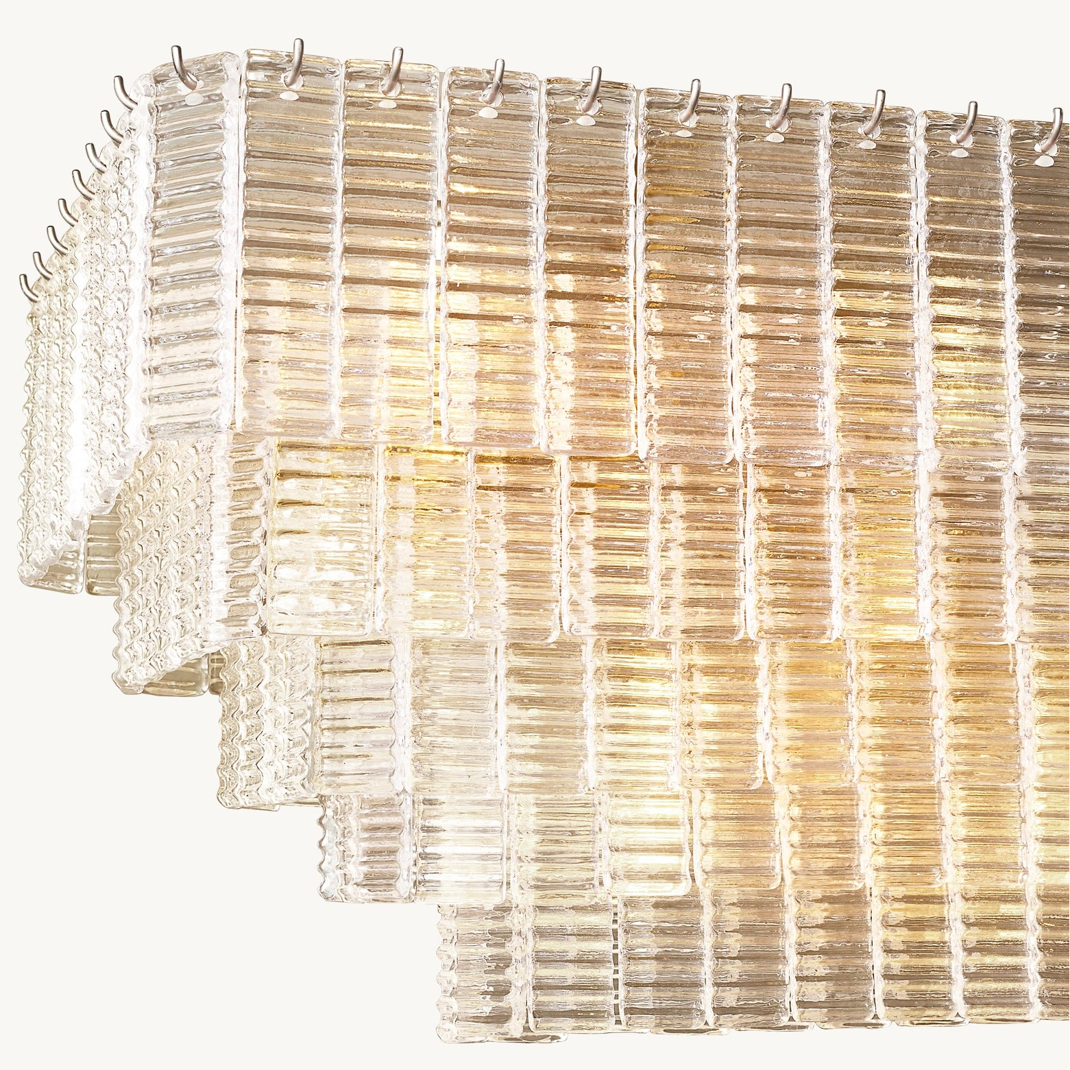 Hommage au design vénitien des années 1950, ce lustre d'exception puise son inspiration dans l'art verrier de Murano. Il marie avec élégance la tradition artisanale au raffinement moderniste. Véritable sculpture lumineuse, il se compose de rubans de verre coulé texturé, disposés en cascade dans une harmonie d'anneaux concentriques. Sa lumière douce et enveloppante sublime l'espace et crée un impact visuel saisissant.