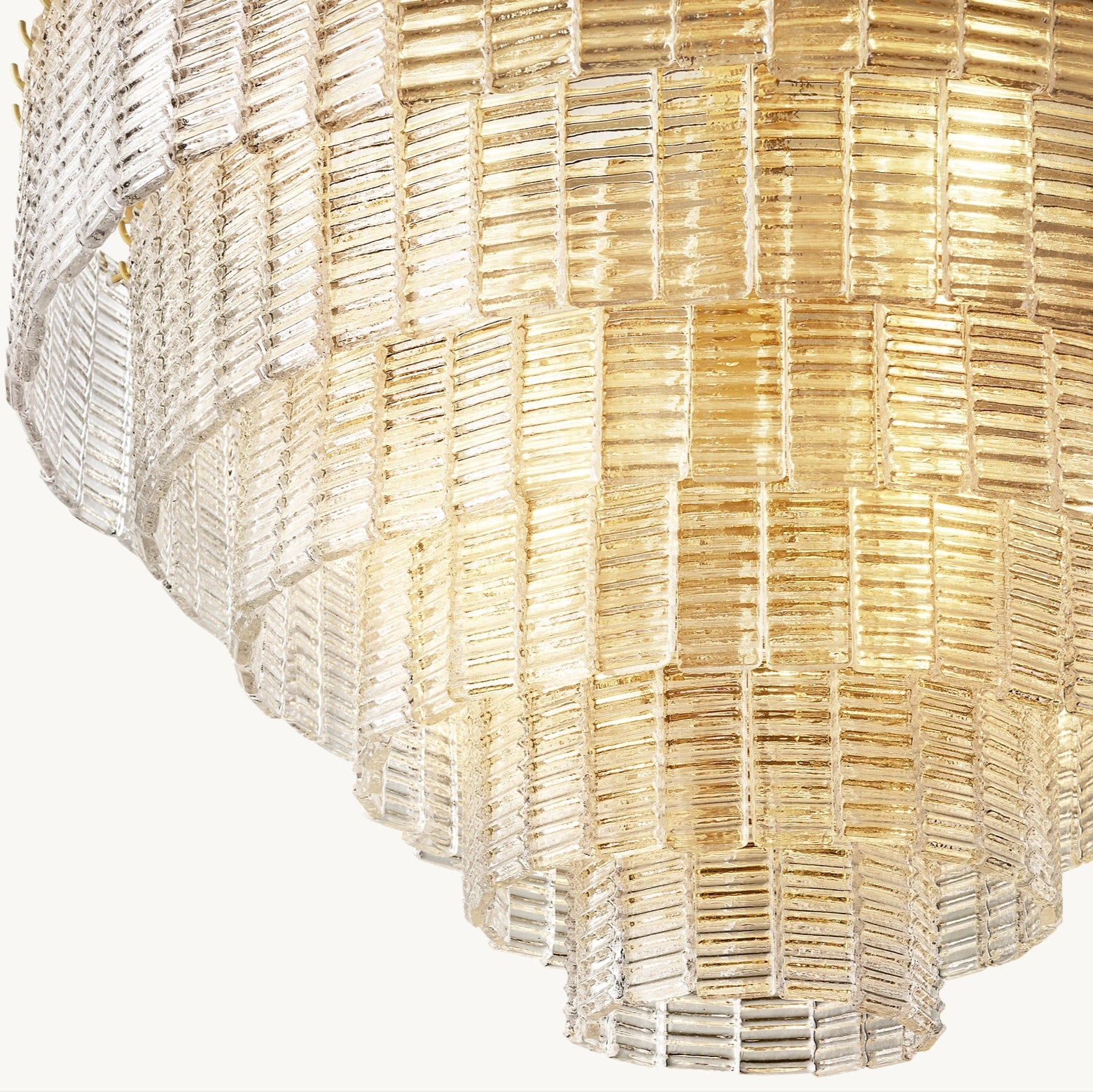 Hommage au design vénitien des années 1950, ce lustre d'exception puise son inspiration dans l'art verrier de Murano. Il marie avec élégance la tradition artisanale au raffinement moderniste. Véritable sculpture lumineuse, il se compose de rubans de verre coulé texturé, disposés en cascade dans une harmonie d'anneaux concentriques. Sa lumière douce et enveloppante sublime l'espace et crée un impact visuel saisissant.
