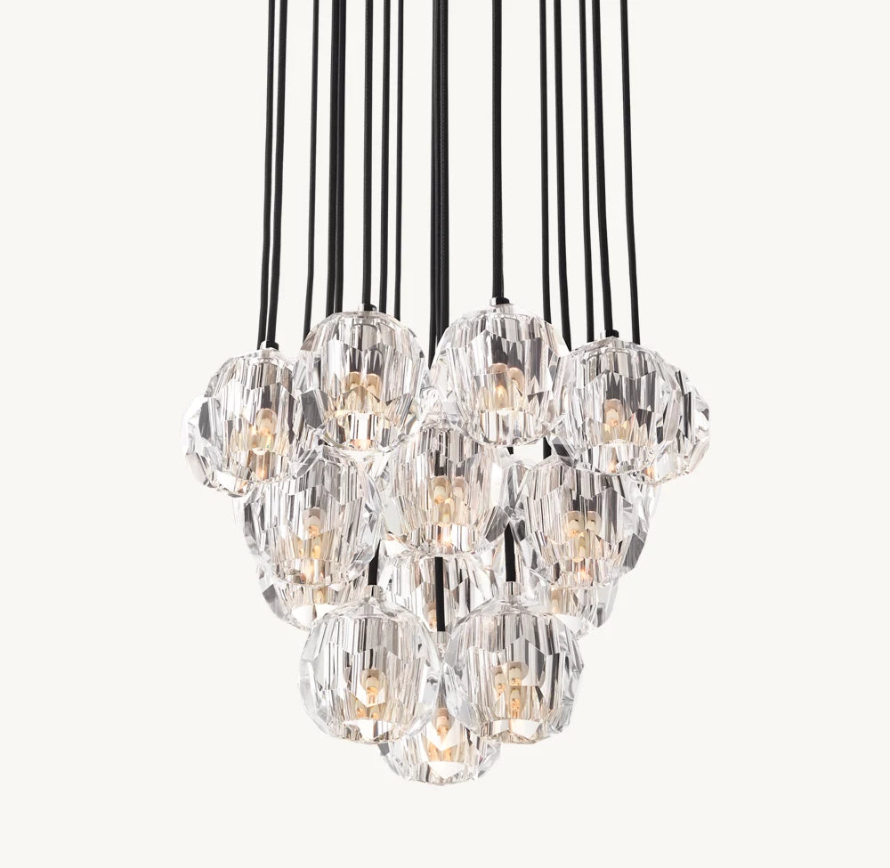 Conçu en laiton massif et en verre cristal, ce luminaire sculptural témoigne d’une passion pour les matériaux luxueux et le savoir-faire d’exception. Inspirée par l’esprit minimaliste du design des années 1960, chaque sphère finement facettée est taillée et polie à la main pour refléter et réfracter la lumière avec éclat.