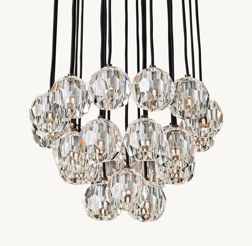 Conçu en laiton massif et en verre cristal, ce luminaire sculptural témoigne d’une passion pour les matériaux luxueux et le savoir-faire d’exception. Inspirée par l’esprit minimaliste du design des années 1960, chaque sphère finement facettée est taillée et polie à la main pour refléter et réfracter la lumière avec éclat.
