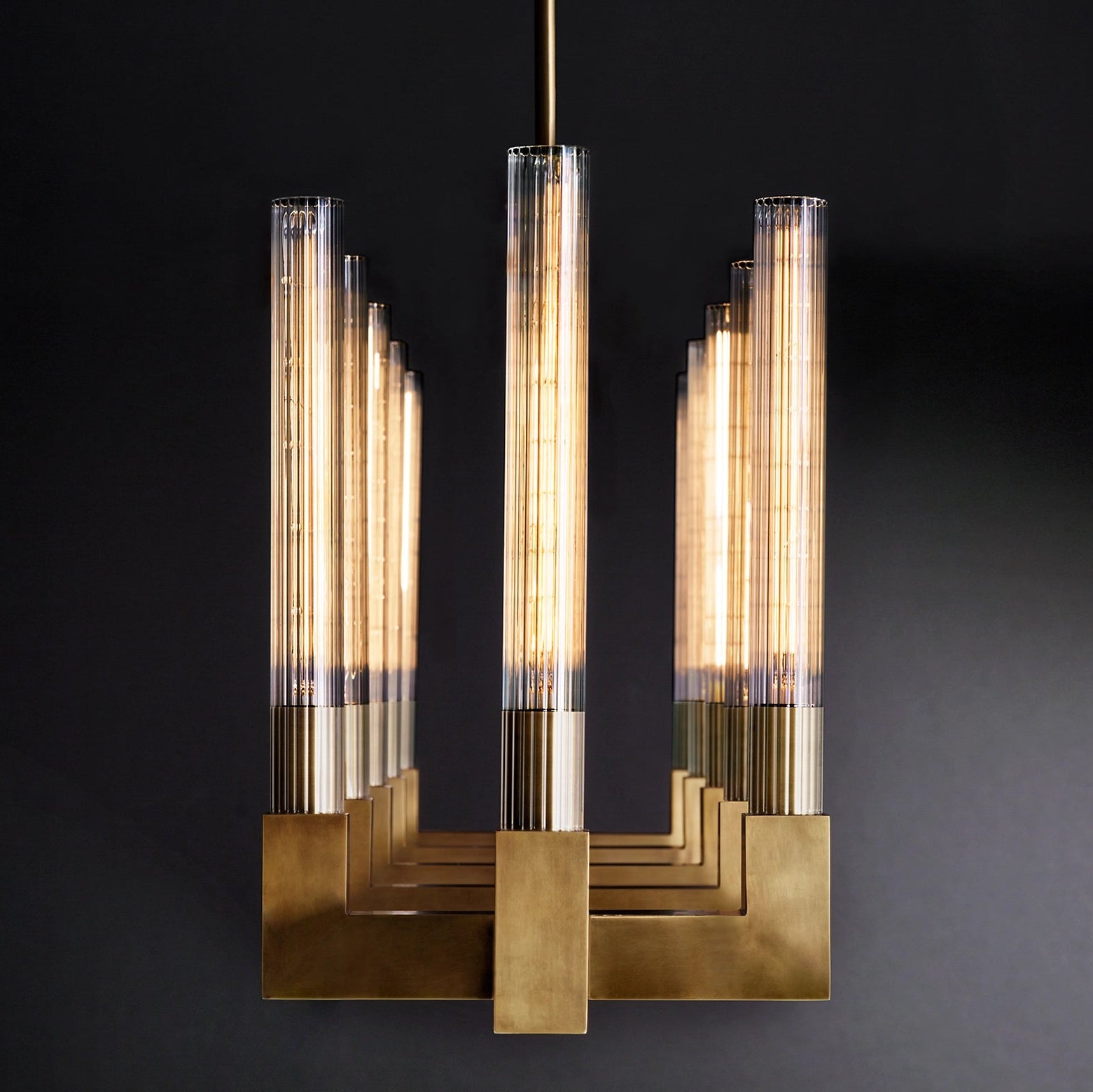 Valmont modernise l'élégance classique du lustre Beaux-Arts. Réalisée en laiton massif, sa structure géométrique encadre des coupoles en verre strié, accueillant des ampoules à filament qui diffusent une lumière chaude, presque cérémoniale.