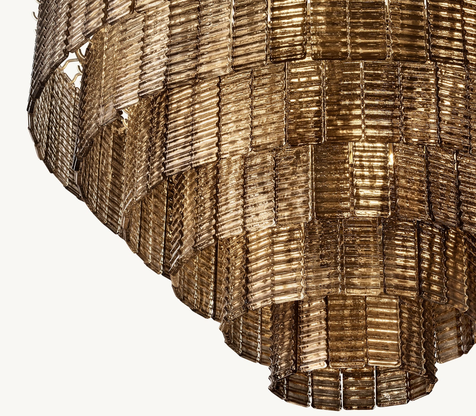 Hommage au design vénitien des années 1950, ce lustre d'exception puise son inspiration dans l'art verrier de Murano. Il marie avec élégance la tradition artisanale au raffinement moderniste. Véritable sculpture lumineuse, il se compose de rubans de verre coulé texturé, disposés en cascade dans une harmonie d'anneaux concentriques. Sa lumière douce et enveloppante sublime l'espace et crée un impact visuel saisissant.