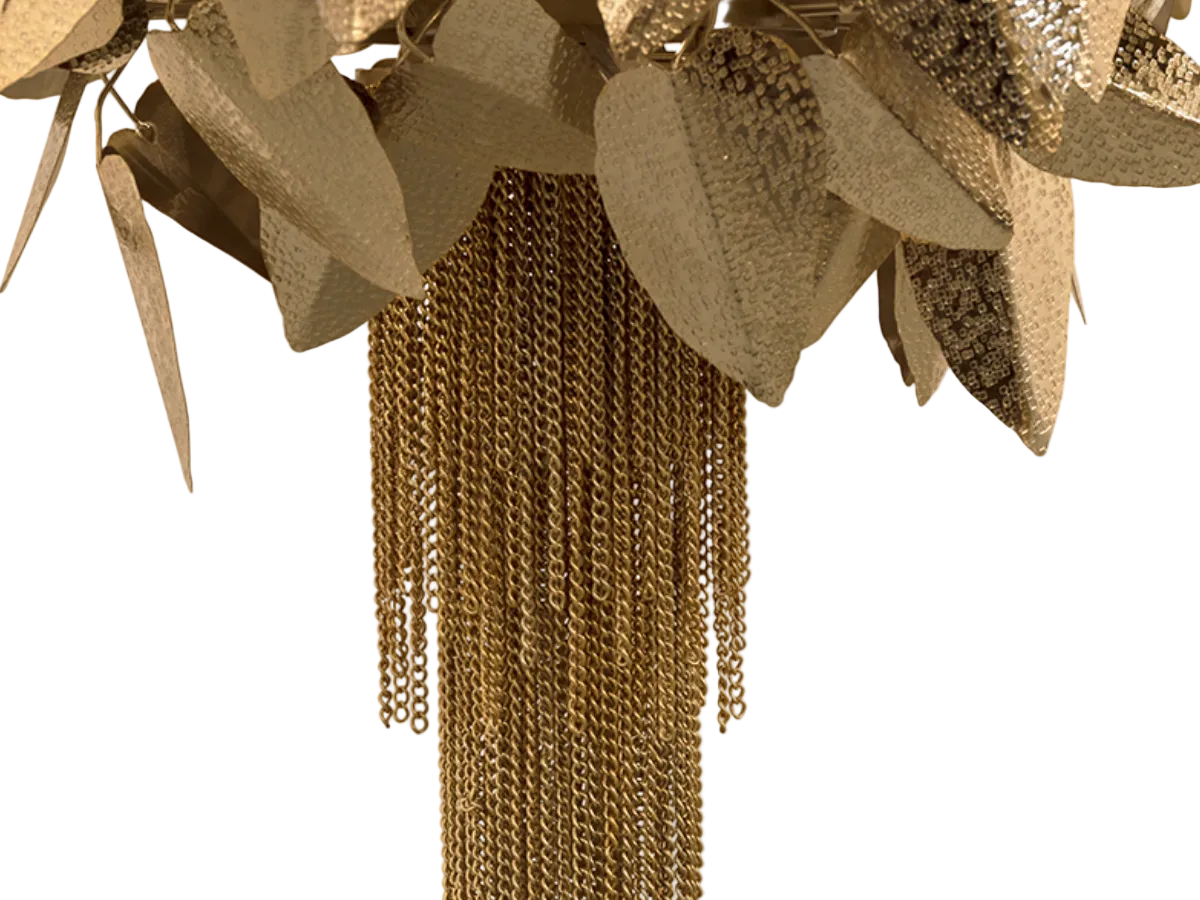 Sa structure en laiton finement travaillée, ornée de feuilles sculptées et ponctuées de cristaux K9 scintillants la richesse décorative des grandes demeures historiques. Pensé comme une œuvre d’art suspendue, il transforme l’espace par sa présence.