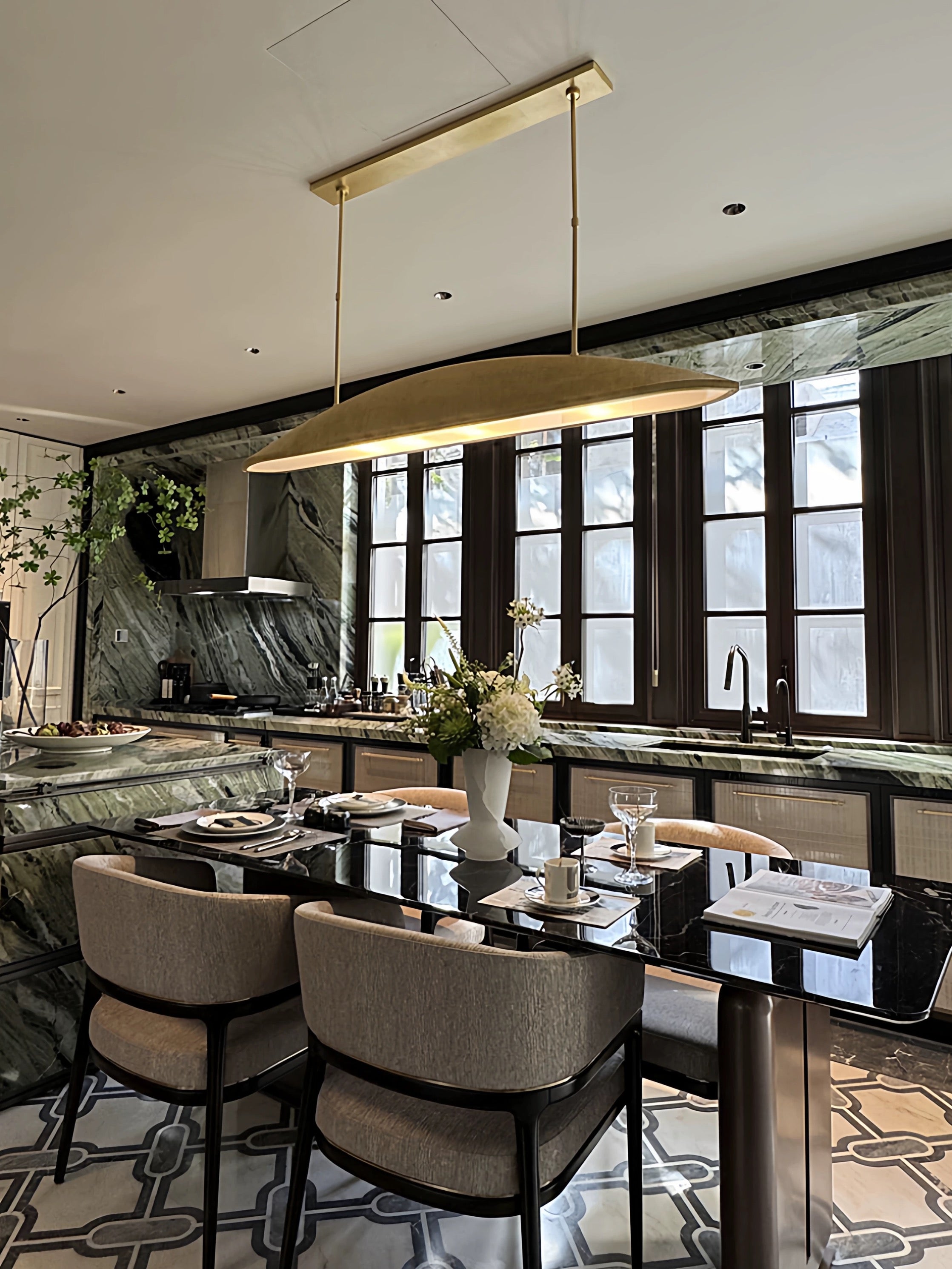 Évoquant l’héritage de l’Art déco français, le lustre Marais revisite les codes du luxe avec une approche contemporaine. Son abat-jour en laiton aux finitions dorées, associé à une suspension linéaire épurée, créant une ambiance feutrée et raffinée,