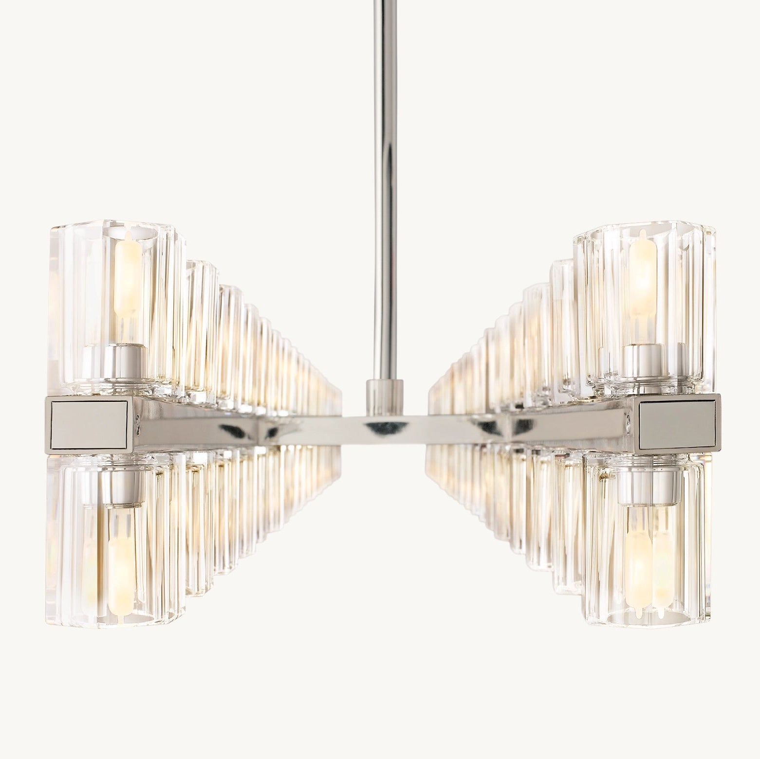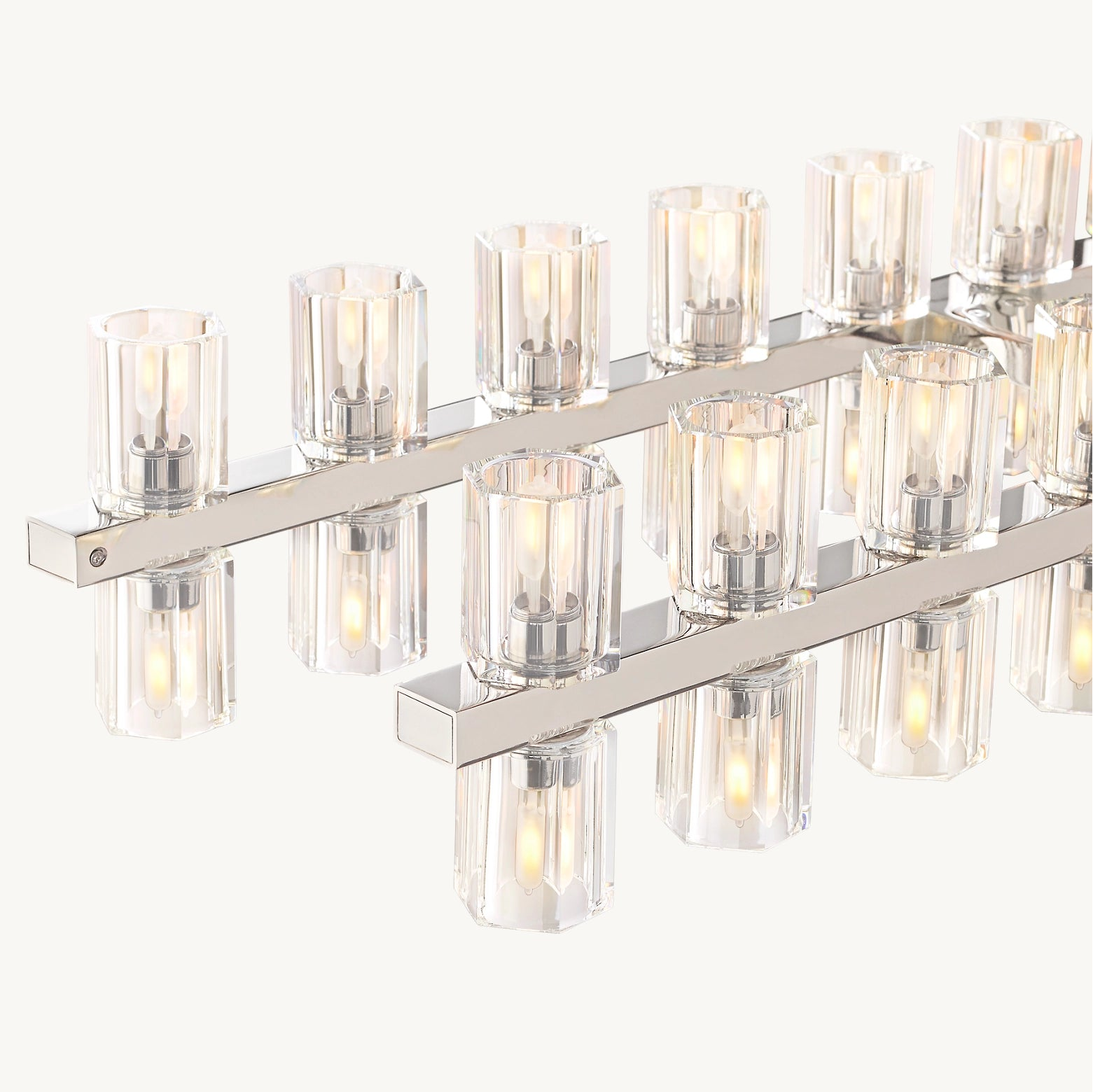 La collection Rouage s’inspire des engrenages industriels et de leurs proportions méticuleuses. Les rayons, sous forme de hexagones parfaitement imbriqués, s’entrelacent harmonieusement avec des éléments arrondis en cristal. Le tout repose sur une structure métallique solide, créant un jeu de lumière unique et dynamique qui capte l'œil.