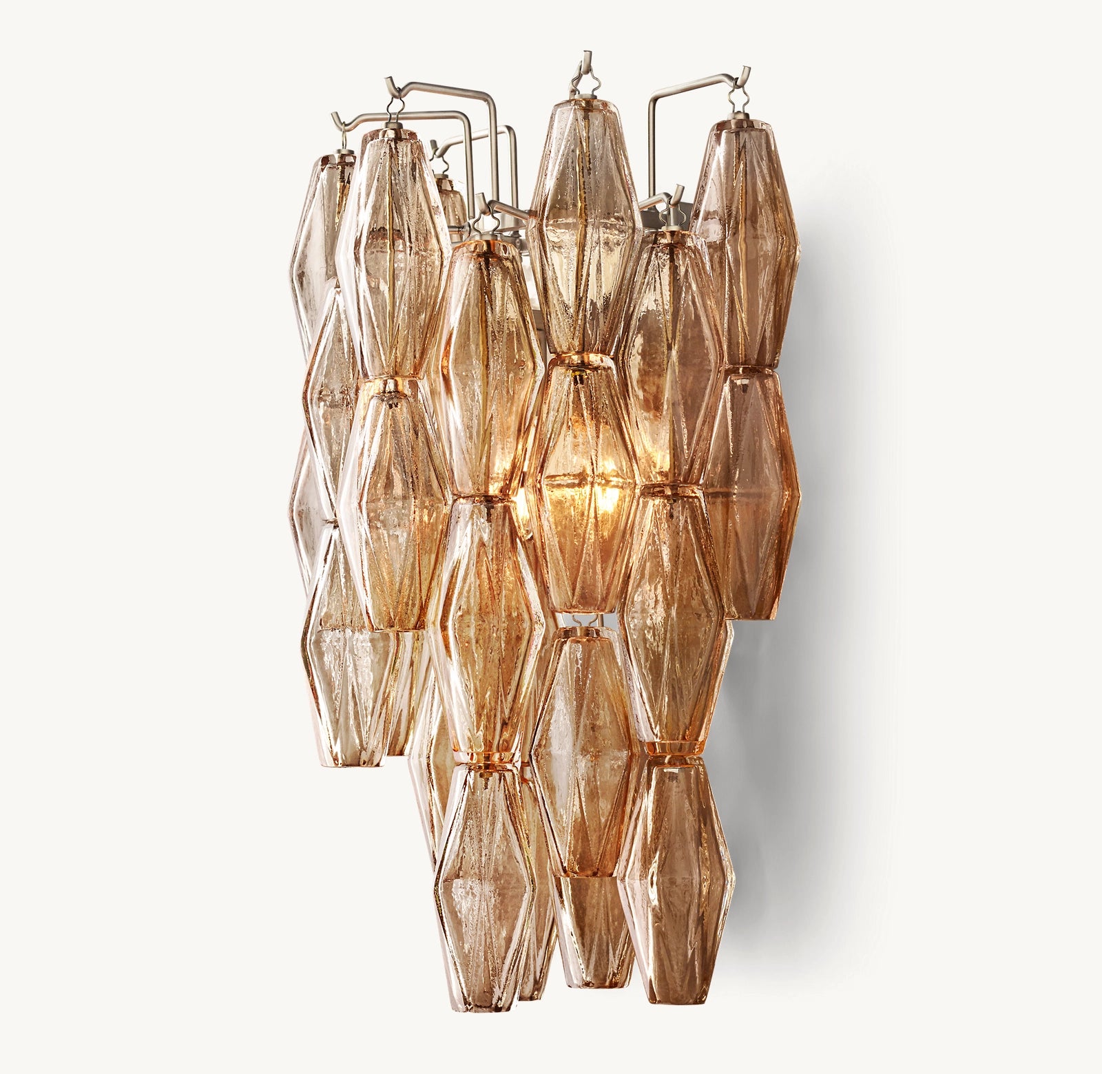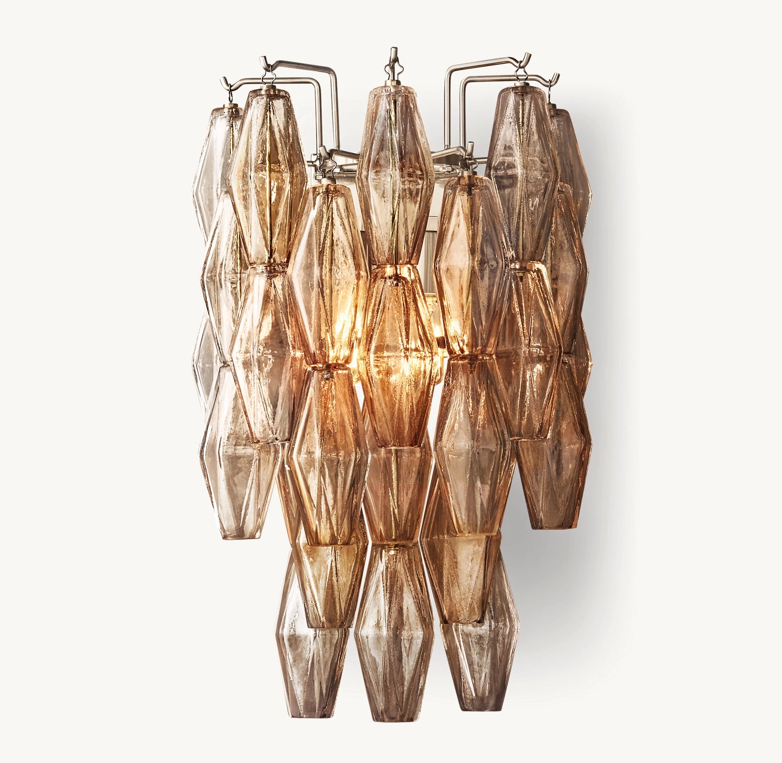 Ce modèle revisite les luminaires emblématiques de Murano des années 1950 avec une approche architecturale. Une armature en acier accueille des polyèdres en verre soufflé artisanal, chacun suspendu sur son crochet pour une modularité parfaite. Leur découpe facettée crée une diffraction lumineuse maîtrisée, jouant avec la transparence et la brillance du verre.