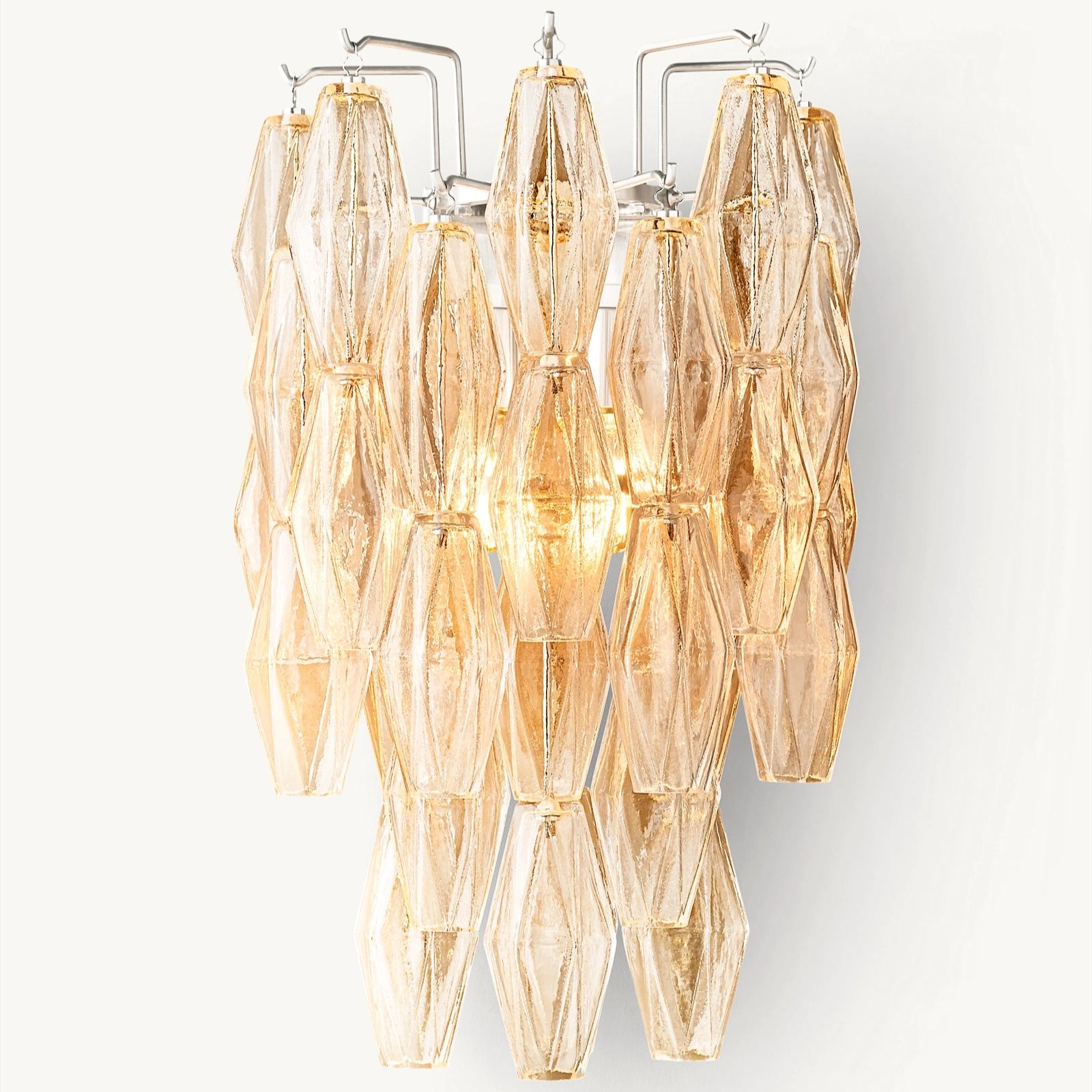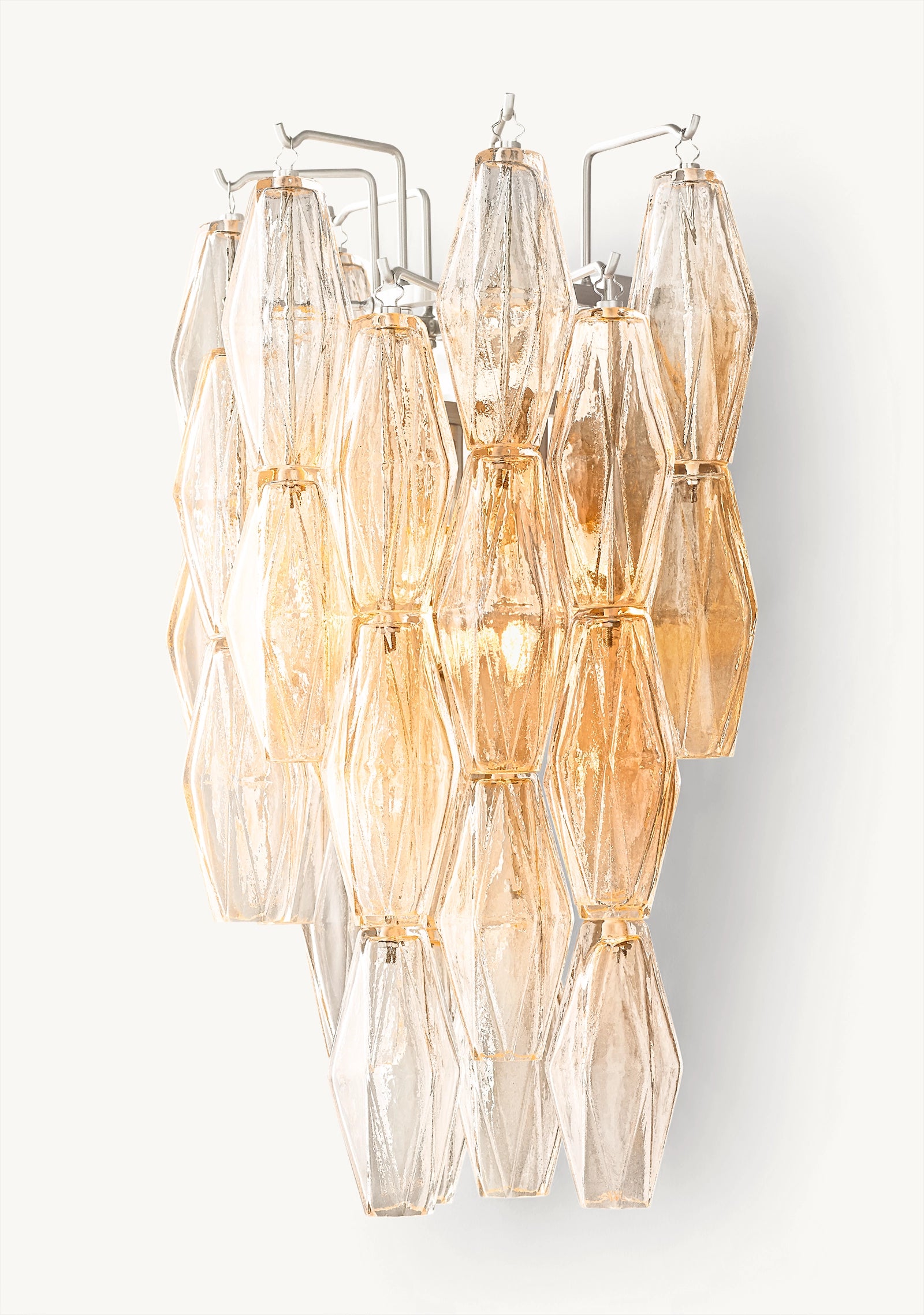 Ce modèle revisite les luminaires emblématiques de Murano des années 1950 avec une approche architecturale. Une armature en acier accueille des polyèdres en verre soufflé artisanal, chacun suspendu sur son crochet pour une modularité parfaite. Leur découpe facettée crée une diffraction lumineuse maîtrisée, jouant avec la transparence et la brillance du verre.