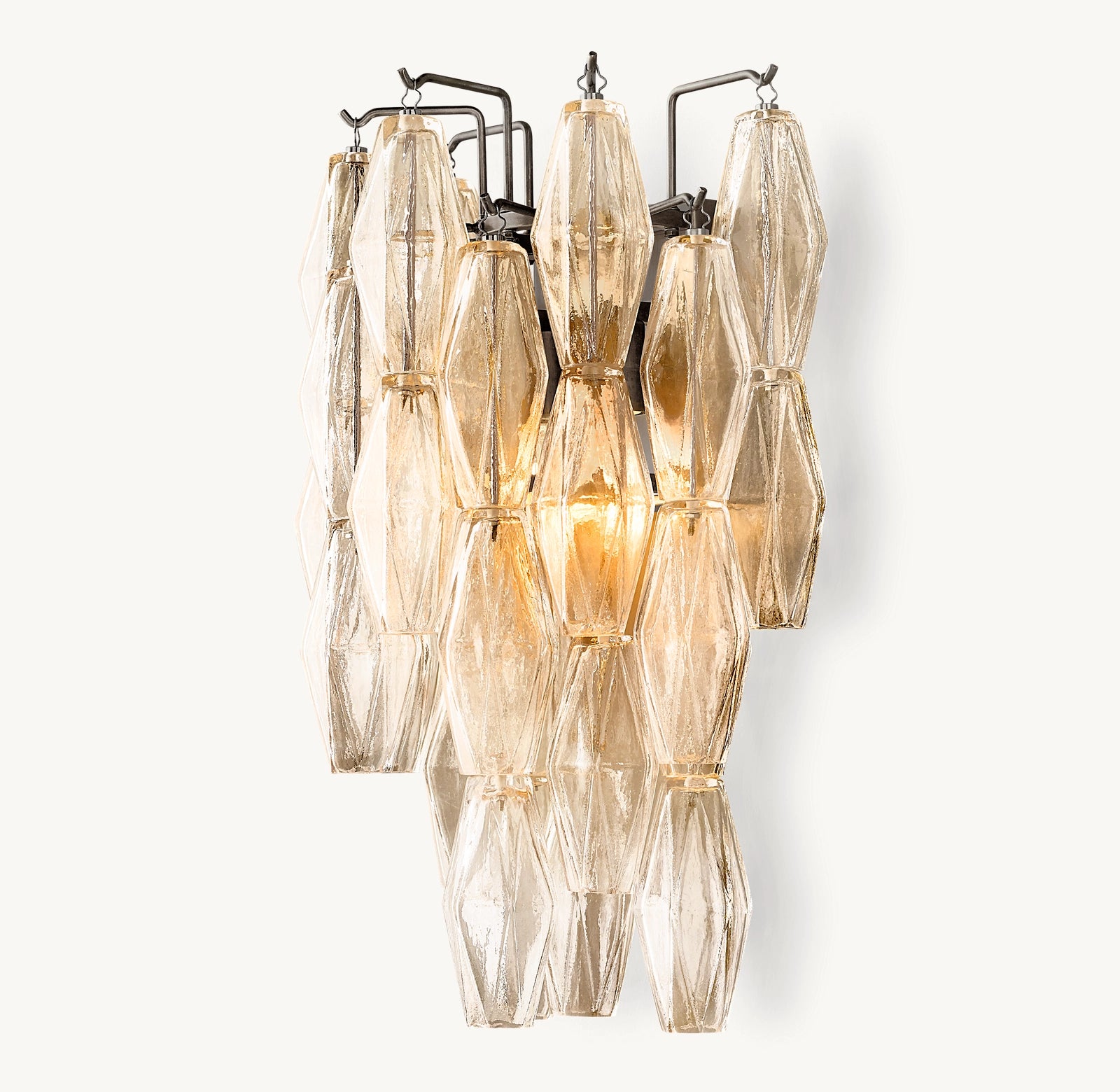 Ce modèle revisite les luminaires emblématiques de Murano des années 1950 avec une approche architecturale. Une armature en acier accueille des polyèdres en verre soufflé artisanal, chacun suspendu sur son crochet pour une modularité parfaite. Leur découpe facettée crée une diffraction lumineuse maîtrisée, jouant avec la transparence et la brillance du verre.