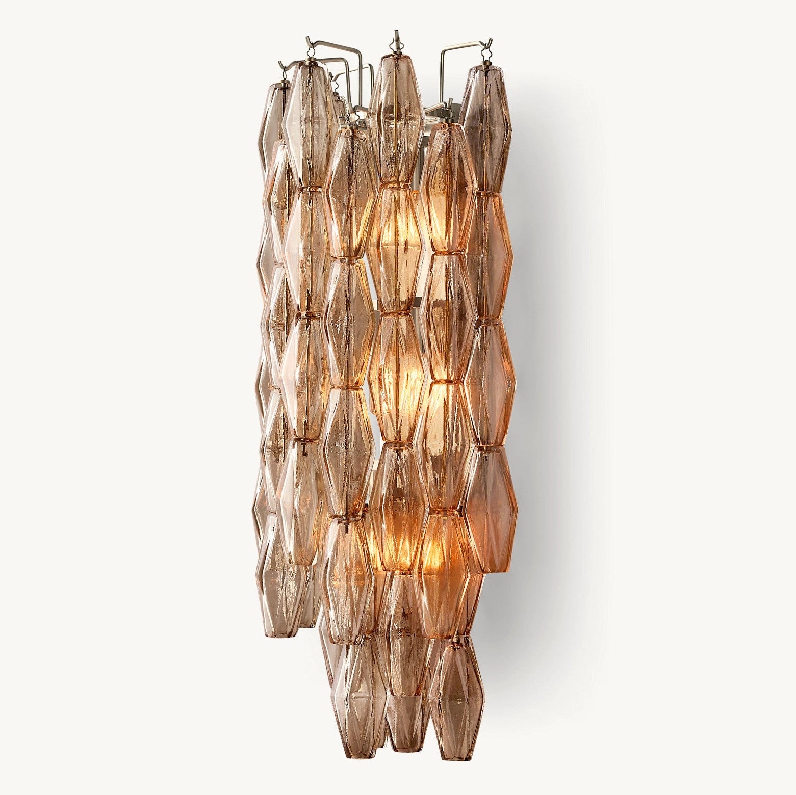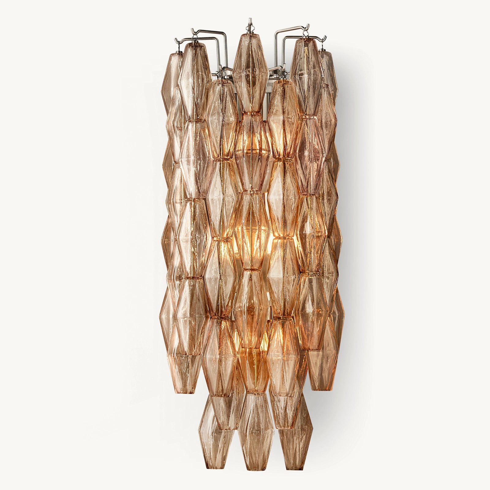 Ce modèle revisite les luminaires emblématiques de Murano des années 1950 avec une approche architecturale. Une armature en acier accueille des polyèdres en verre soufflé artisanal, chacun suspendu sur son crochet pour une modularité parfaite. Leur découpe facettée crée une diffraction lumineuse maîtrisée, jouant avec la transparence et la brillance du verre.
