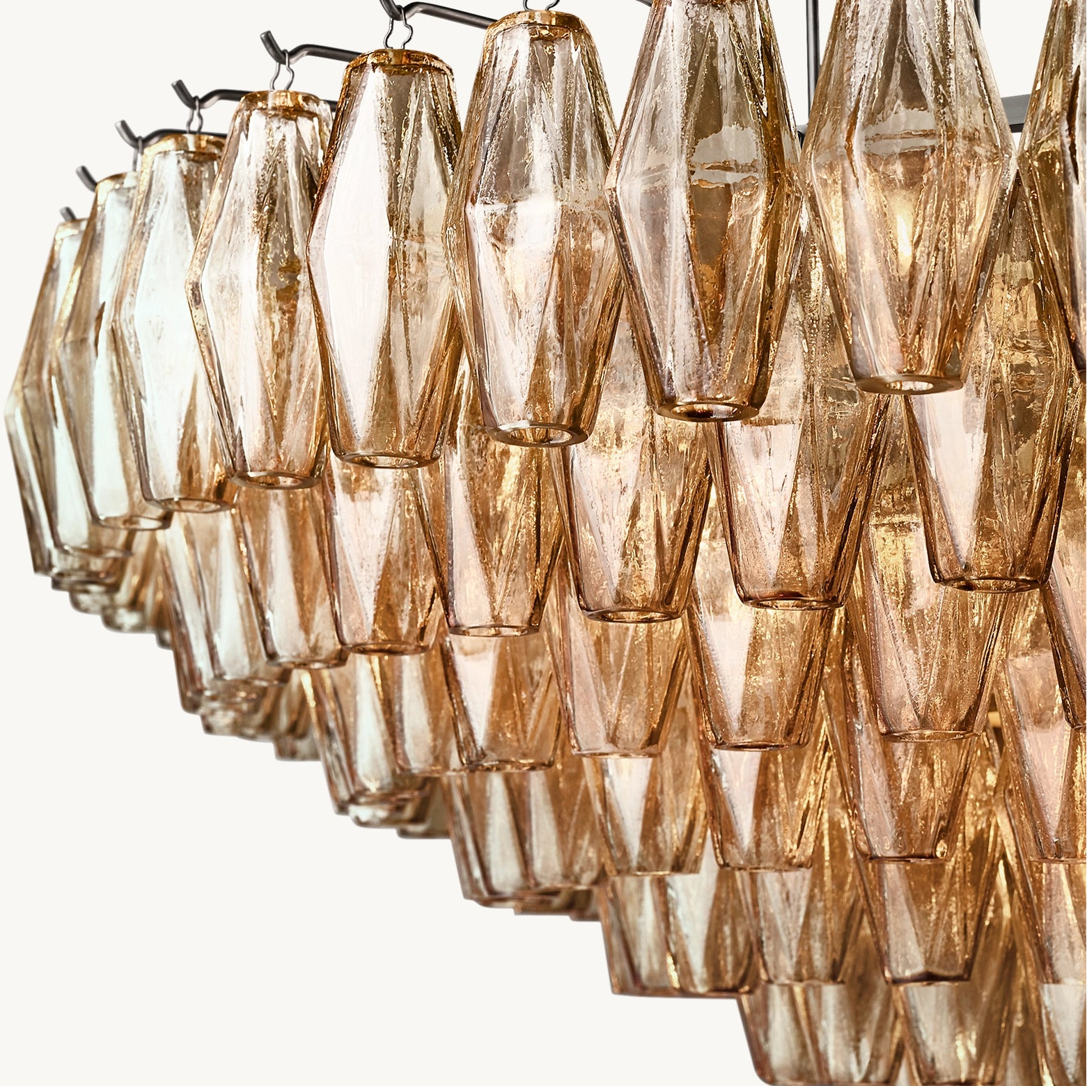 Ce modèle revisite les luminaires emblématiques de Murano des années 1950 avec une approche architecturale. Une armature en acier accueille des polyèdres en verre soufflé artisanal, chacun suspendu sur son crochet pour une modularité parfaite. Leur découpe facettée crée une diffraction lumineuse maîtrisée, jouant avec la transparence et la brillance du verre.