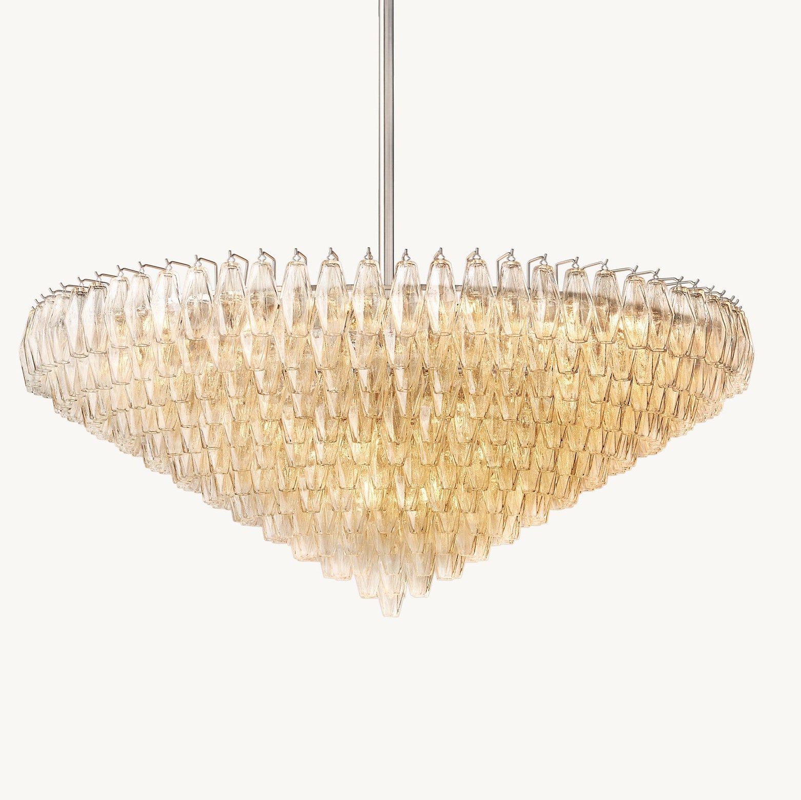 Ce modèle revisite les luminaires emblématiques de Murano des années 1950 avec une approche architecturale. Une armature en acier accueille des polyèdres en verre soufflé artisanal, chacun suspendu sur son crochet pour une modularité parfaite. Leur découpe facettée crée une diffraction lumineuse maîtrisée, jouant avec la transparence et la brillance du verre.