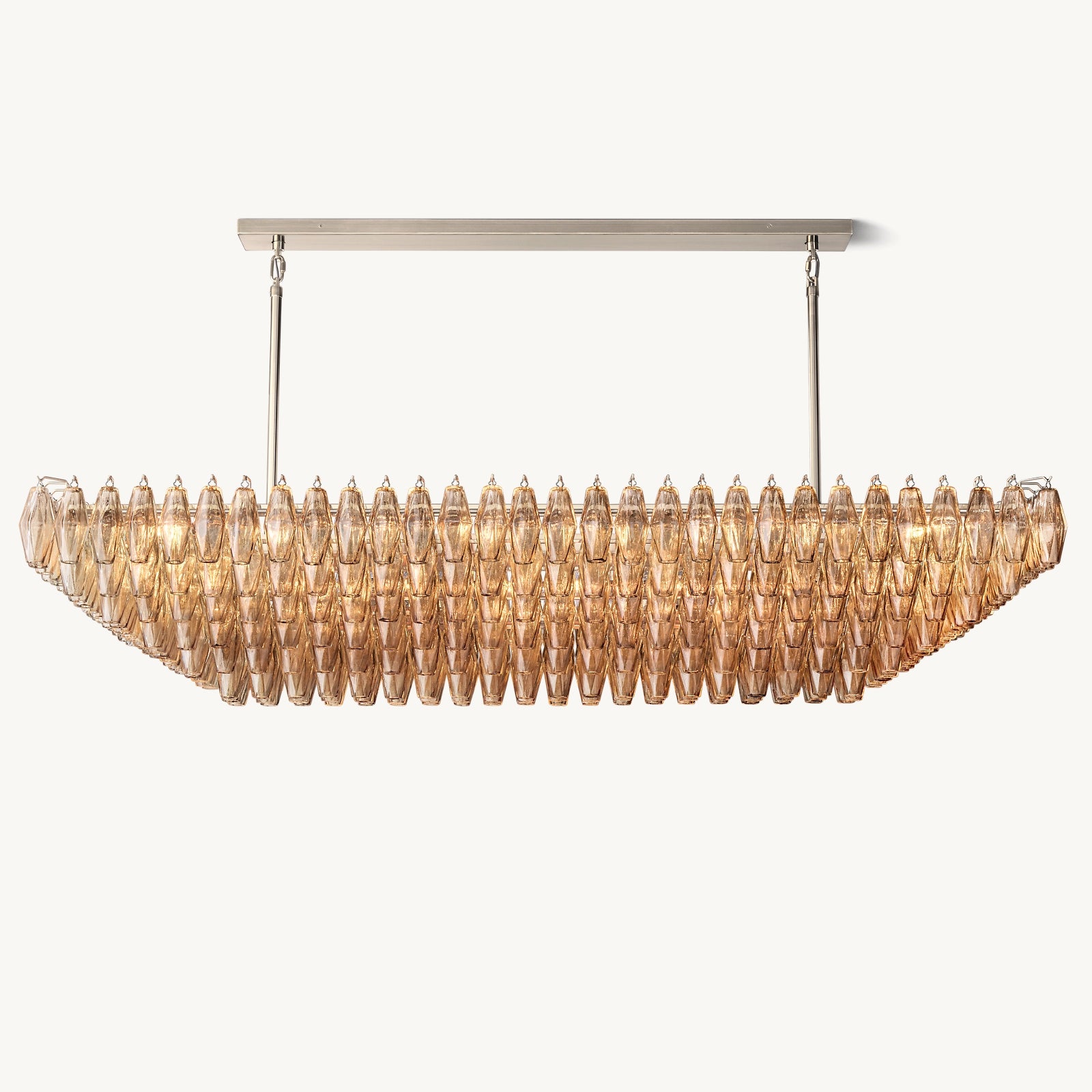 Ce modèle revisite les luminaires emblématiques de Murano des années 1950 avec une approche architecturale. Une armature en acier accueille des polyèdres en verre soufflé artisanal, chacun suspendu sur son crochet pour une modularité parfaite. Leur découpe facettée crée une diffraction lumineuse maîtrisée, jouant avec la transparence et la brillance du verre.