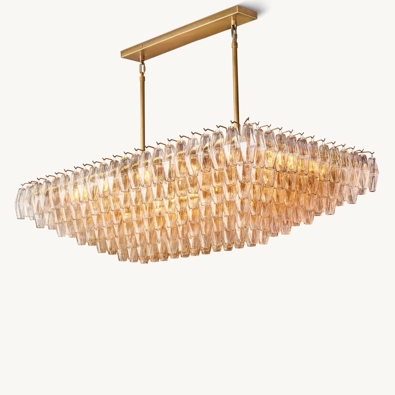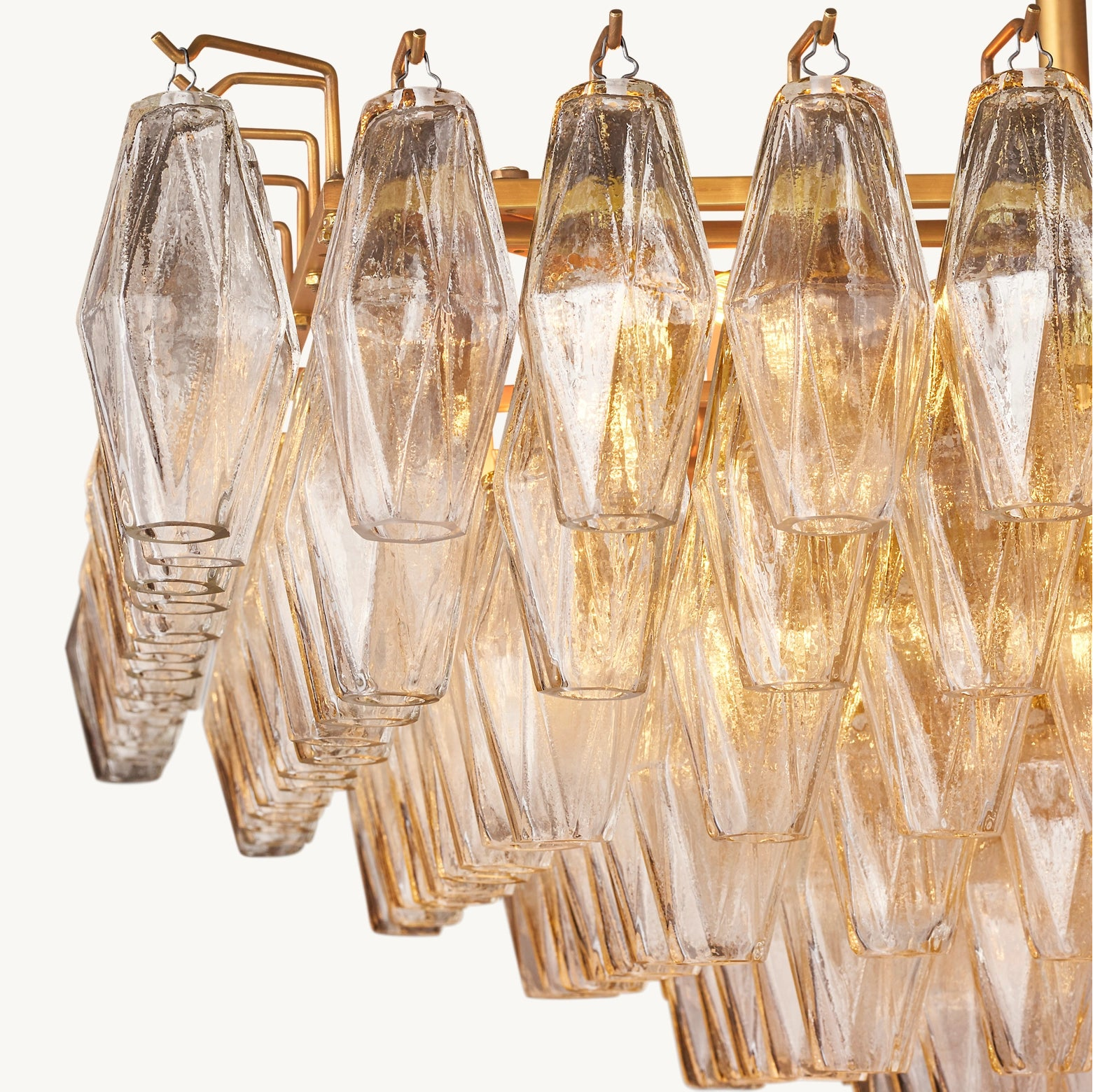 Ce modèle revisite les luminaires emblématiques de Murano des années 1950 avec une approche architecturale. Une armature en acier accueille des polyèdres en verre soufflé artisanal, chacun suspendu sur son crochet pour une modularité parfaite. Leur découpe facettée crée une diffraction lumineuse maîtrisée, jouant avec la transparence et la brillance du verre.