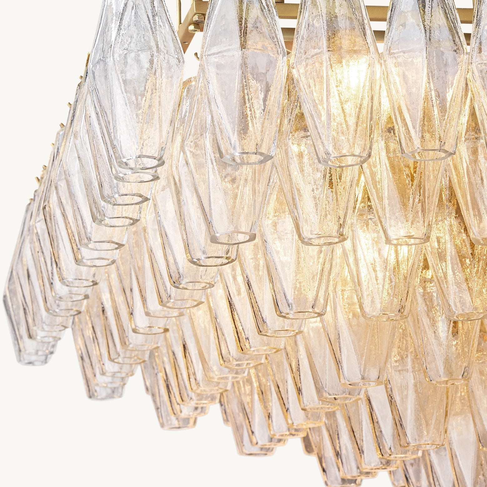 Ce modèle revisite les luminaires emblématiques de Murano des années 1950 avec une approche architecturale. Une armature en acier accueille des polyèdres en verre soufflé artisanal, chacun suspendu sur son crochet pour une modularité parfaite. Leur découpe facettée crée une diffraction lumineuse maîtrisée, jouant avec la transparence et la brillance du verre.