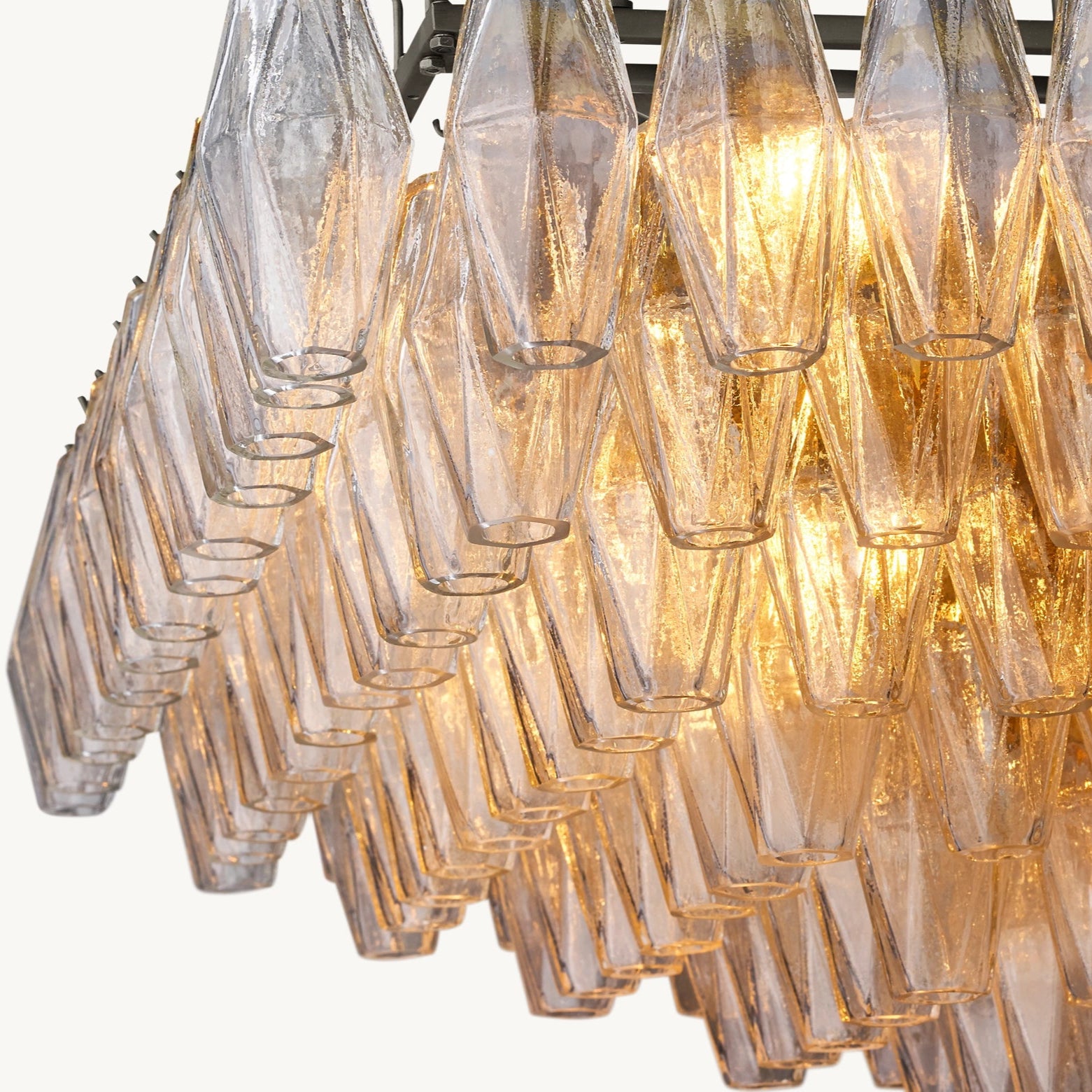 Ce modèle revisite les luminaires emblématiques de Murano des années 1950 avec une approche architecturale. Une armature en acier accueille des polyèdres en verre soufflé artisanal, chacun suspendu sur son crochet pour une modularité parfaite. Leur découpe facettée crée une diffraction lumineuse maîtrisée, jouant avec la transparence et la brillance du verre.