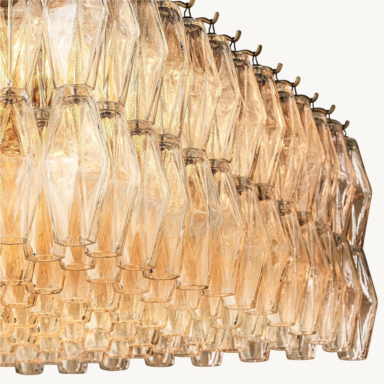 Ce modèle revisite les luminaires emblématiques de Murano des années 1950 avec une approche architecturale. Une armature en acier accueille des polyèdres en verre soufflé artisanal, chacun suspendu sur son crochet pour une modularité parfaite. Leur découpe facettée crée une diffraction lumineuse maîtrisée, jouant avec la transparence et la brillance du verre.