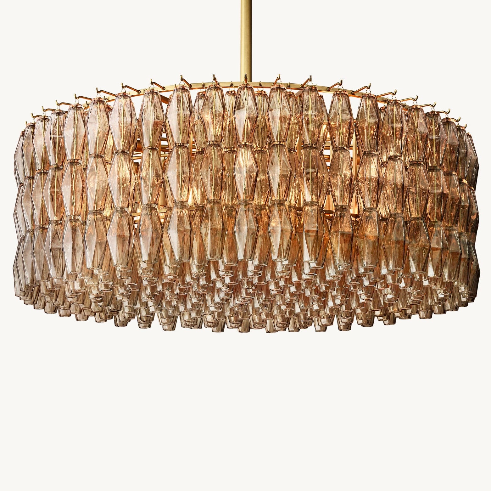 Ce modèle revisite les luminaires emblématiques de Murano des années 1950 avec une approche architecturale. Une armature en acier accueille des polyèdres en verre soufflé artisanal, chacun suspendu sur son crochet pour une modularité parfaite. Leur découpe facettée crée une diffraction lumineuse maîtrisée, jouant avec la transparence et la brillance du verre.