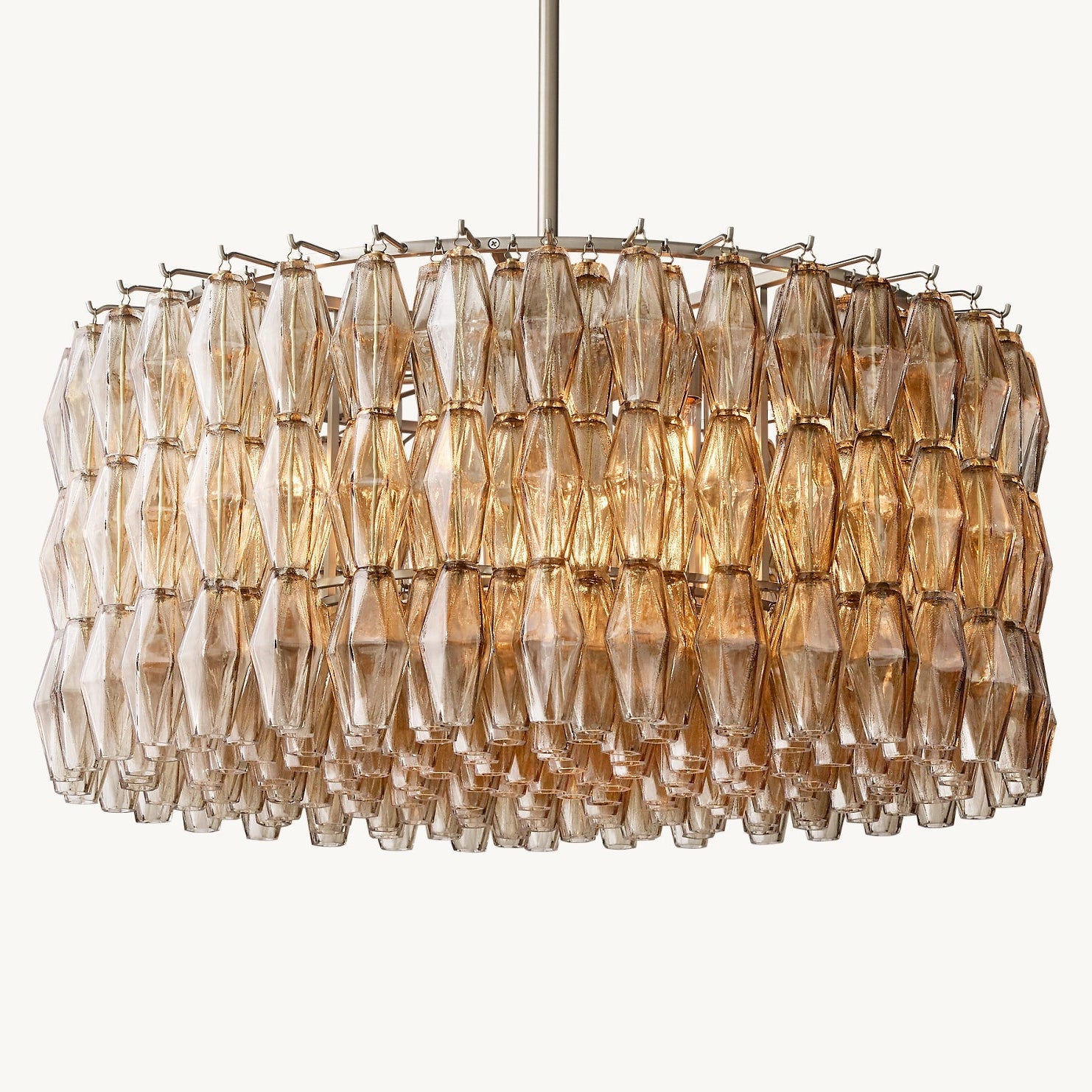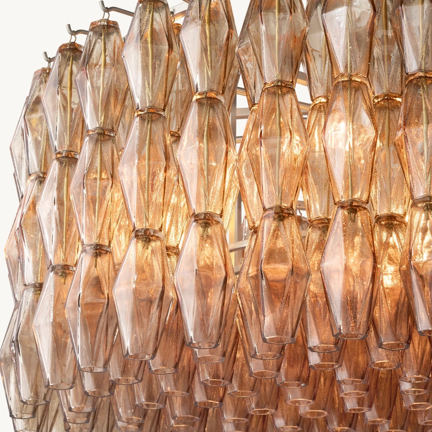 Ce modèle revisite les luminaires emblématiques de Murano des années 1950 avec une approche architecturale. Une armature en acier accueille des polyèdres en verre soufflé artisanal, chacun suspendu sur son crochet pour une modularité parfaite. Leur découpe facettée crée une diffraction lumineuse maîtrisée, jouant avec la transparence et la brillance du verre.