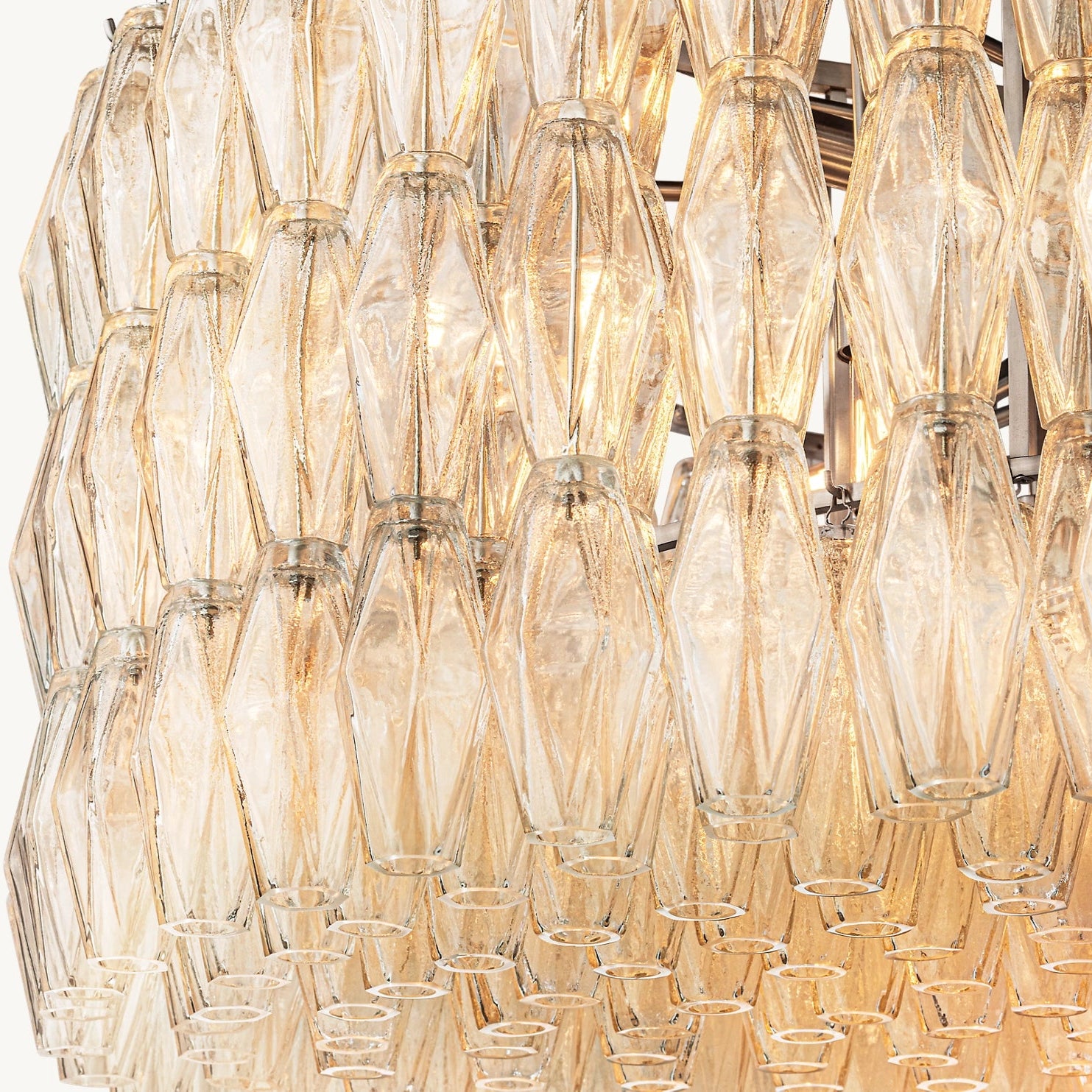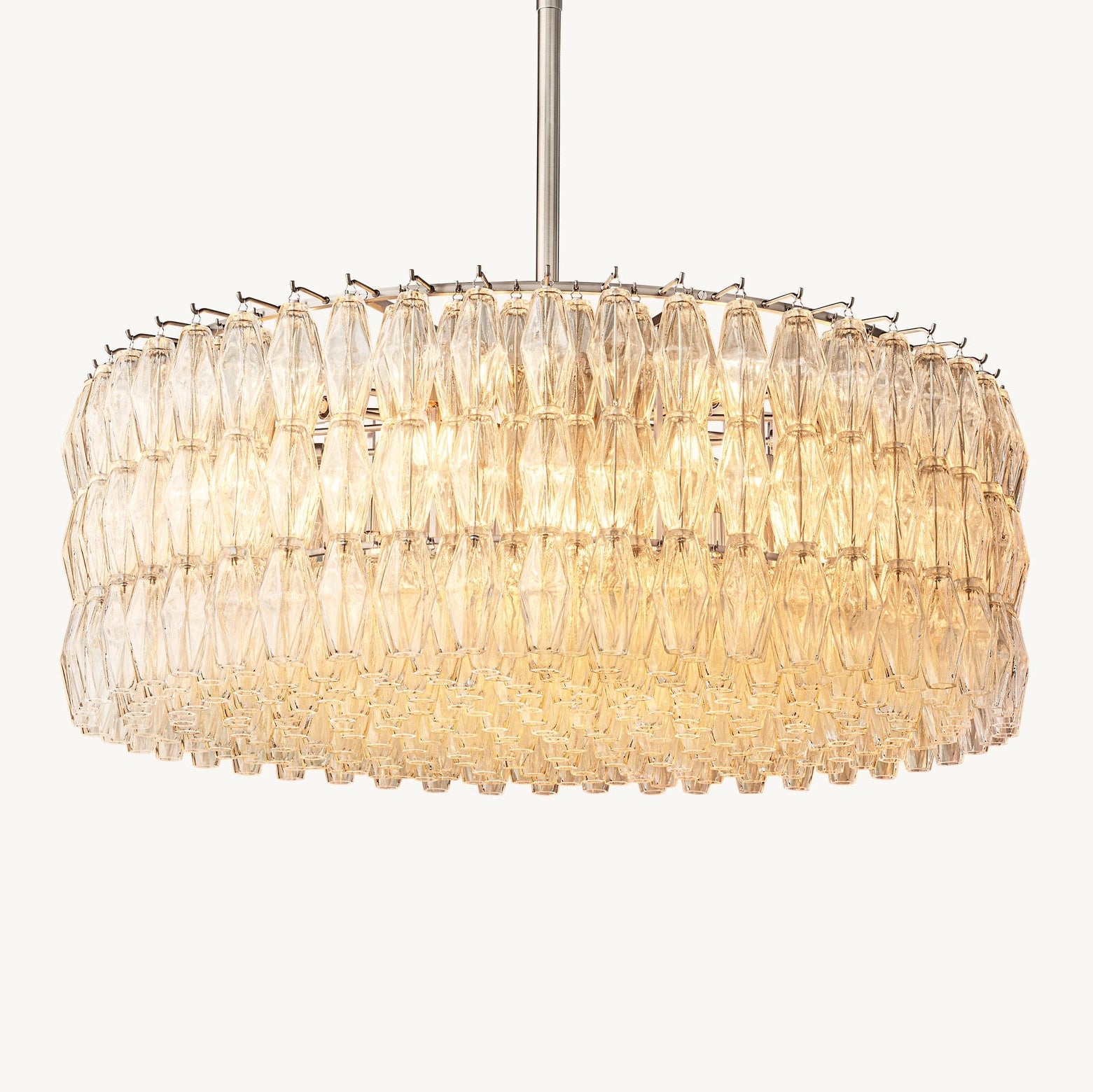 Ce modèle revisite les luminaires emblématiques de Murano des années 1950 avec une approche architecturale. Une armature en acier accueille des polyèdres en verre soufflé artisanal, chacun suspendu sur son crochet pour une modularité parfaite. Leur découpe facettée crée une diffraction lumineuse maîtrisée, jouant avec la transparence et la brillance du verre.