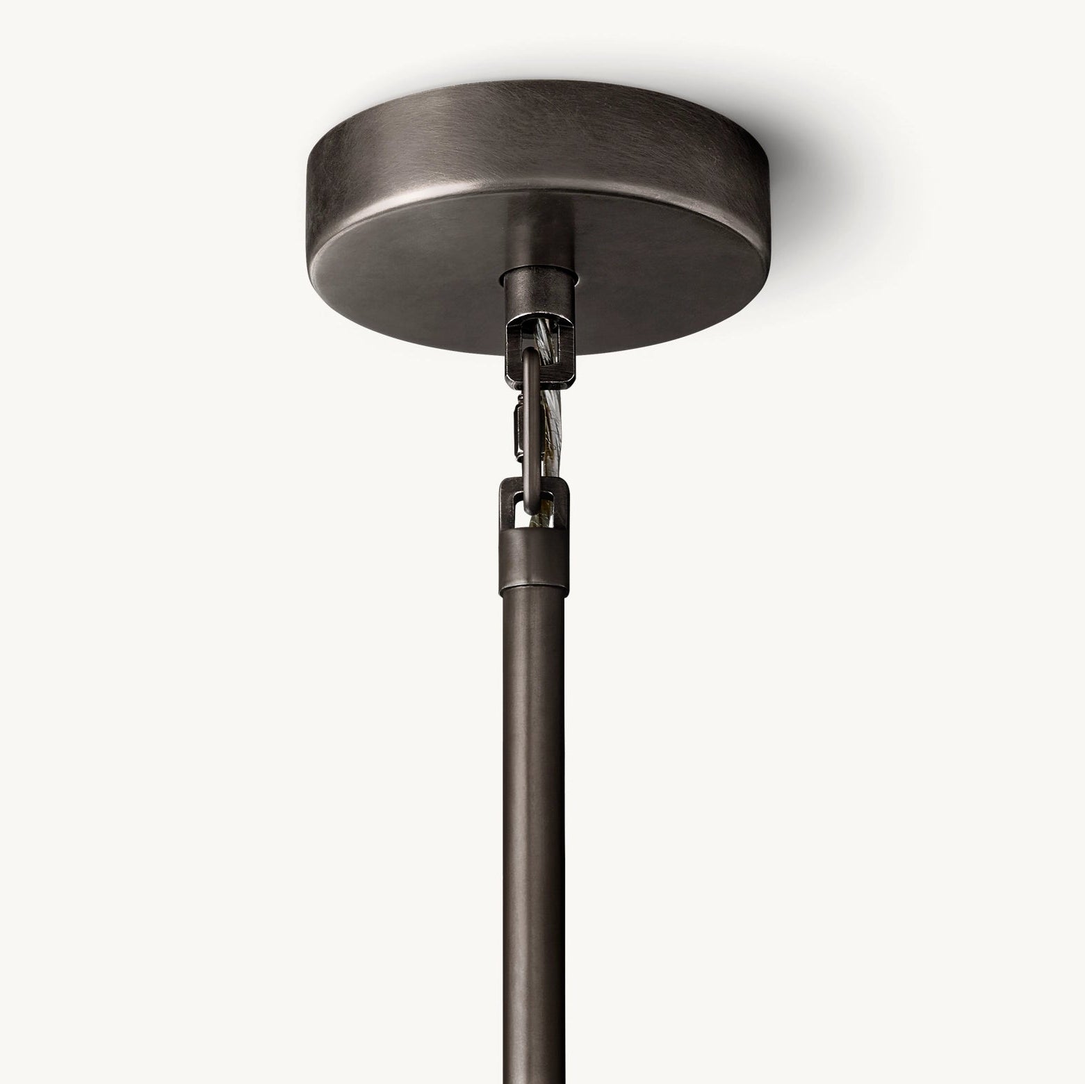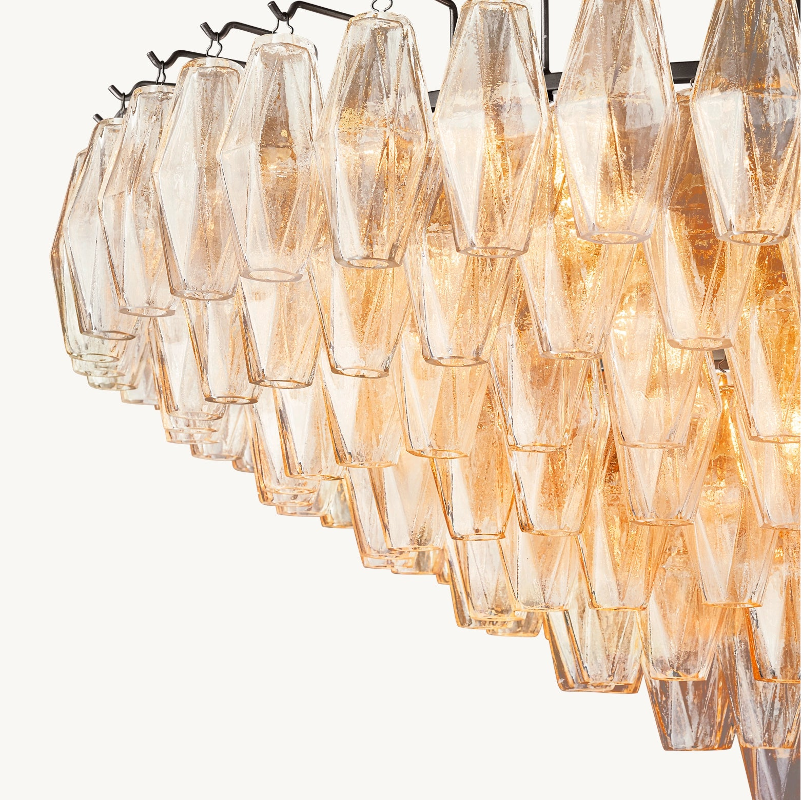 Ce modèle revisite les luminaires emblématiques de Murano des années 1950 avec une approche architecturale. Une armature en acier accueille des polyèdres en verre soufflé artisanal, chacun suspendu sur son crochet pour une modularité parfaite. Leur découpe facettée crée une diffraction lumineuse maîtrisée, jouant avec la transparence et la brillance du verre.