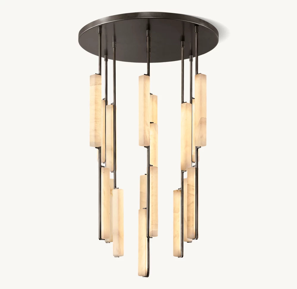 Capturant l'esprit du minimalisme italien des années 1960, le Lustre Bellmont semble s'épanouir en cascade avec ses prismes d'albâtre suspendus à des tiges verticales en laiton.