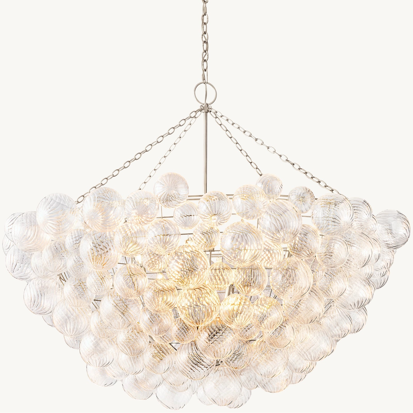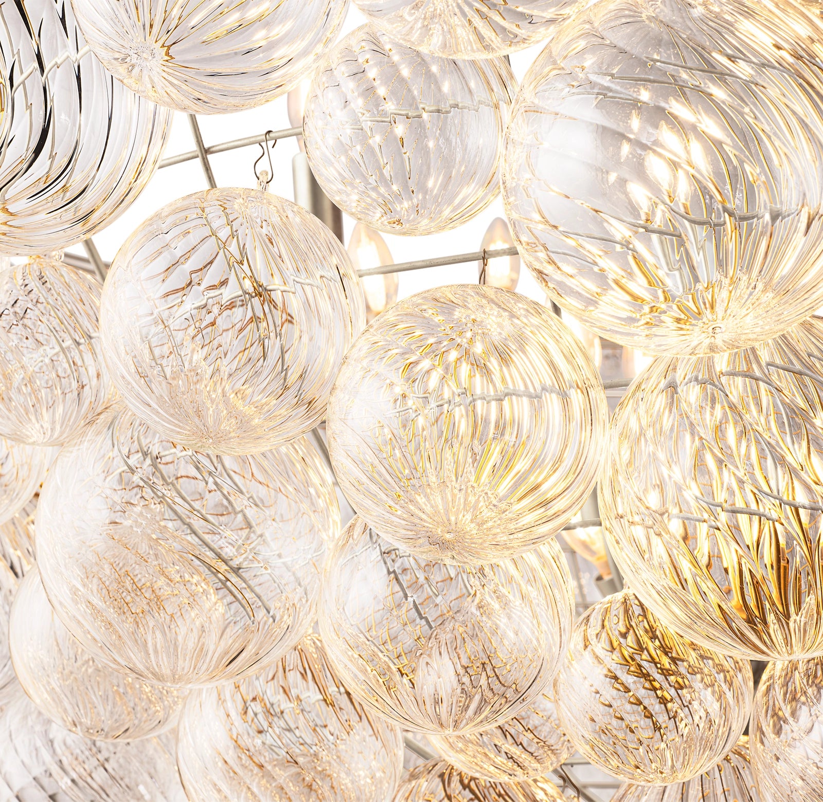 Avec ses 183 globes en verre soufflé artisanal, Éther défie la gravité. Enveloppant une structure métallique sobre, ces sphères tourbillonnantes captent la lumière et la diffractent avec subtilité, créant une texture visuelle riche, mouvante et résolument moderne.