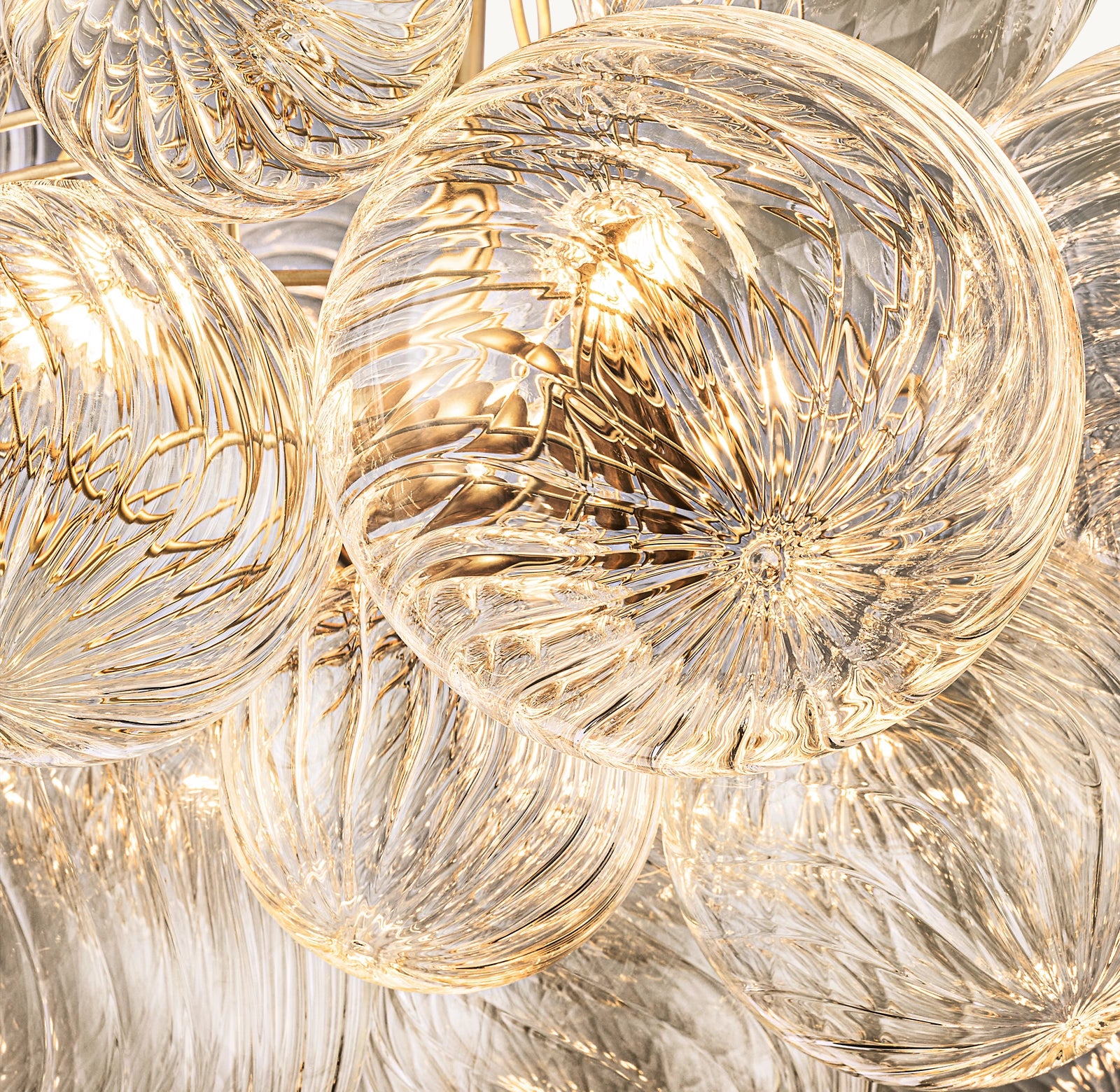 Avec ses 68 globes en verre soufflé artisanal, Éther défie la gravité. Enveloppant une structure métallique sobre, ces sphères tourbillonnantes captent la lumière et la diffractent avec subtilité, créant une texture visuelle riche, mouvante, et résolument moderne.