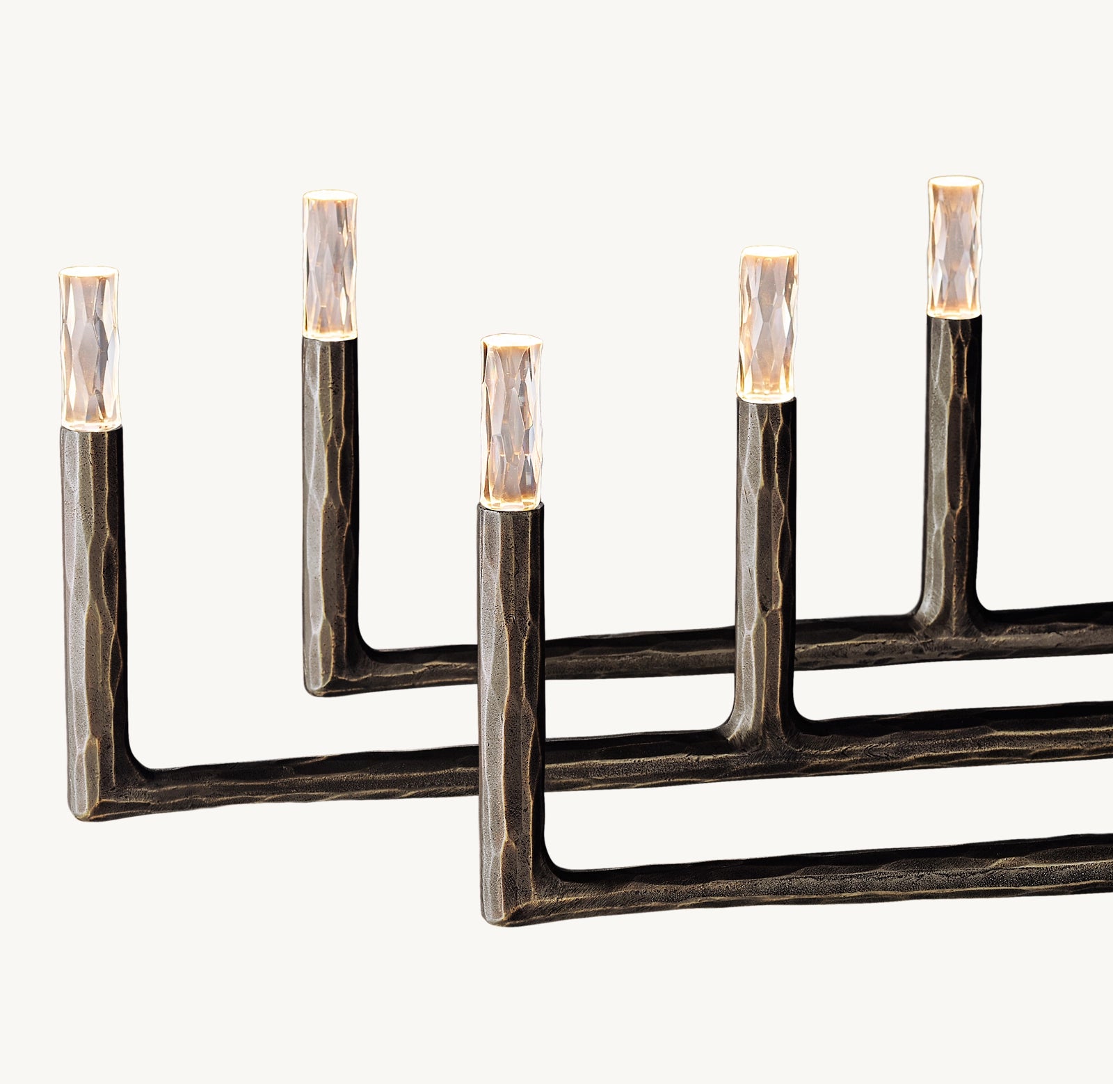 Cette collection rend hommage à l'héritage sculptural de Salvador Dalí et Diego Giacometti. Le laiton massif et l'acier inoxydable sont travaillés à la main selon une méthode traditionnelle : chaque barre martelée révèle une texture unique, brute, presque primitive. Ce relief dialogue vibrant avec la silhouette longiligne et élégante du cadre, dans un équilibre entre force et délicatesse.
