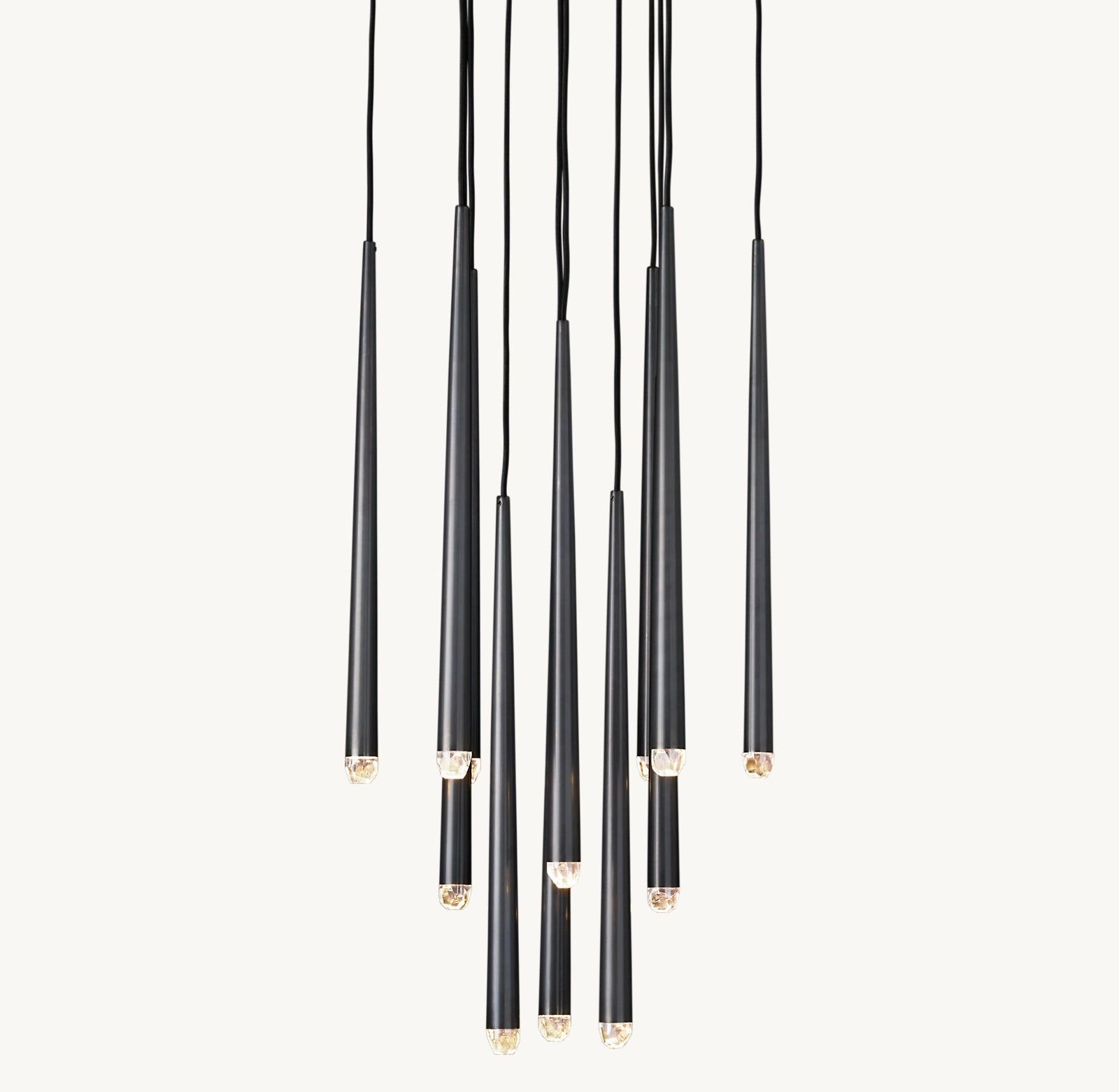 • 12 lumières suspendues à de fins cordons noirs