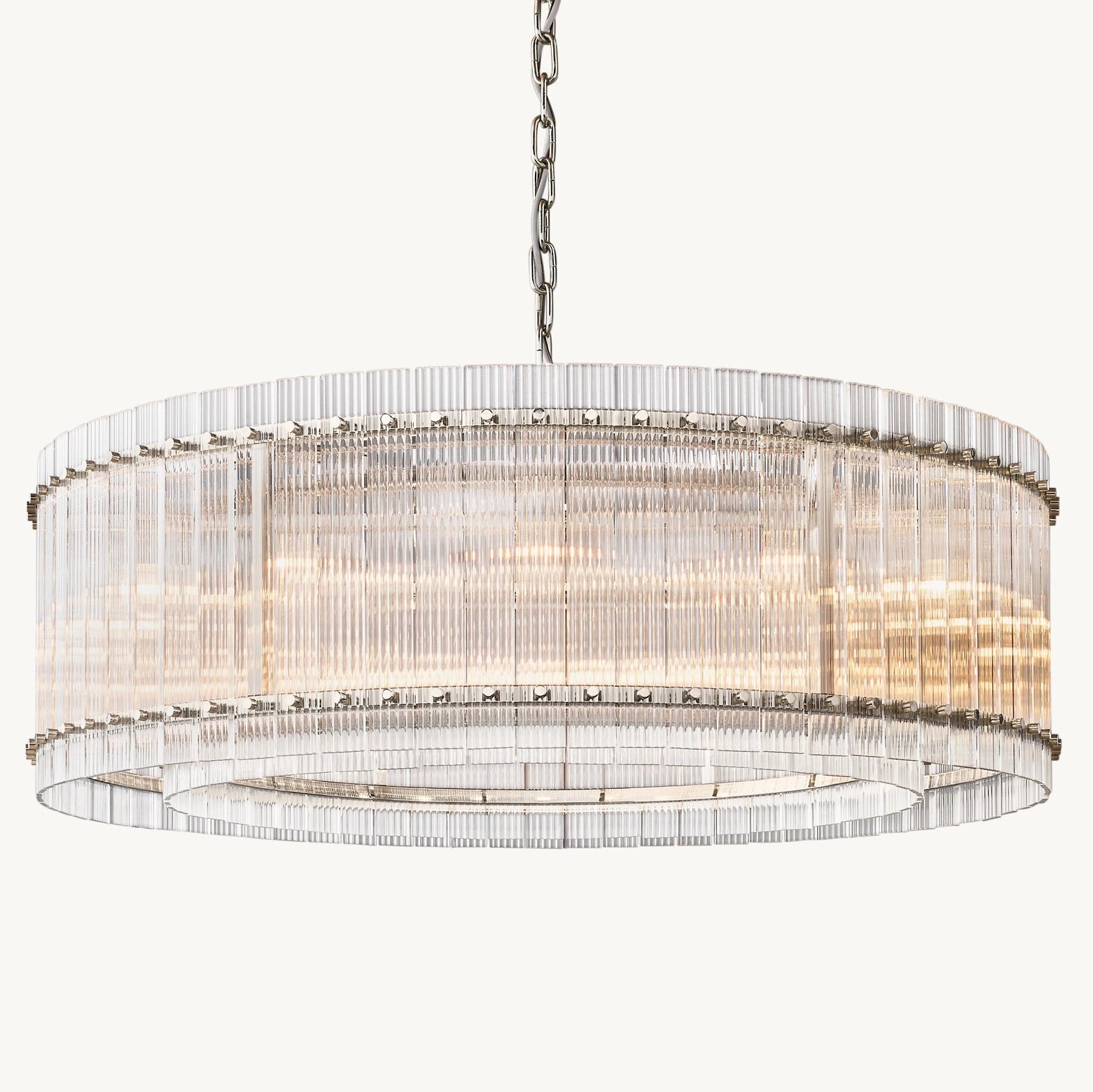 S'inspirant de l'élégance intemporelle des luminaires en verre italiens des années 1960, ce lustre incarne le raffinement et la sophistication. Son cadre métallique accueille des dizaines de panneaux de verre, minutieusement ciselés à la main pour créer une texture cannelée.