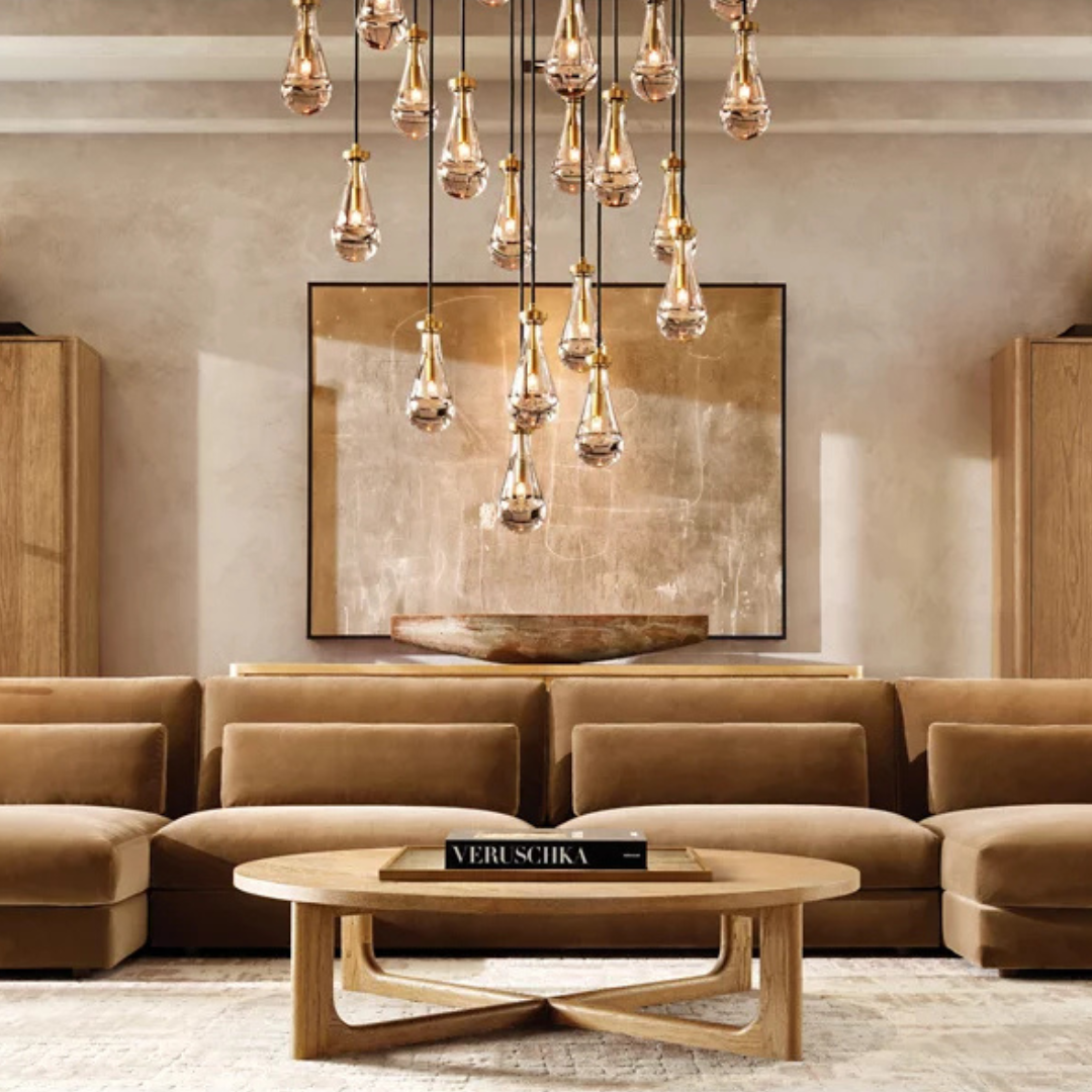 • Les gouttes en verre sont suspendues par un cordon en tissu noir ; la longueur du câble peut être ajustée lors de l’installation professionnelle