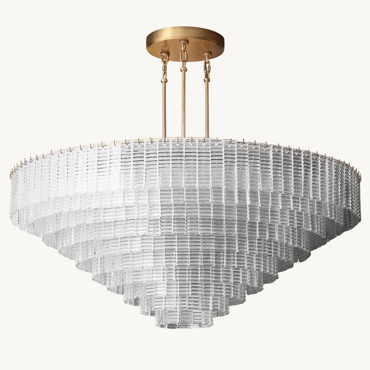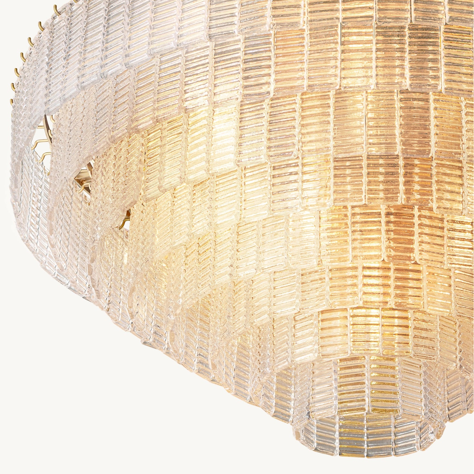 Hommage au design vénitien des années 1950, ce lustre d’exception puise son inspiration dans l’art verrier de Murano. Il marie avec élégance la tradition artisanale au raffinement moderniste. Véritable sculpture lumineuse, il se compose de rubans de verre coulé texturé, disposés en cascade dans une harmonie d’anneaux concentriques. Sa lumière douce et enveloppante sublime l’espace et crée un impact visuel saisissant.