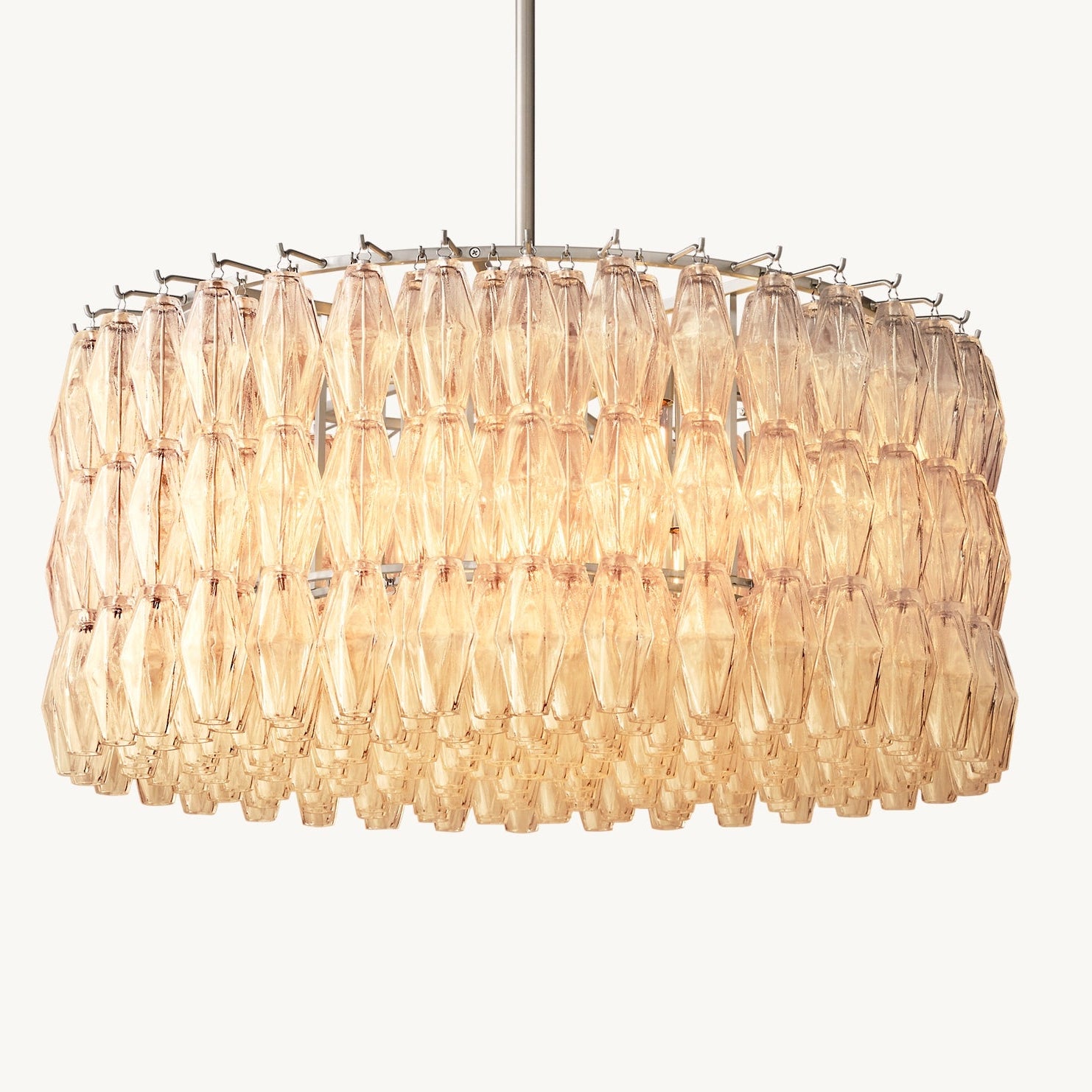 Ce modèle revisite les luminaires emblématiques de Murano des années 1950 avec une approche architecturale. Une armature en acier accueille des polyèdres en verre soufflé artisanal, chacun suspendu sur son crochet pour une modularité parfaite. Leur découpe facettée crée une diffraction lumineuse maîtrisée, jouant avec la transparence et la brillance du verre.