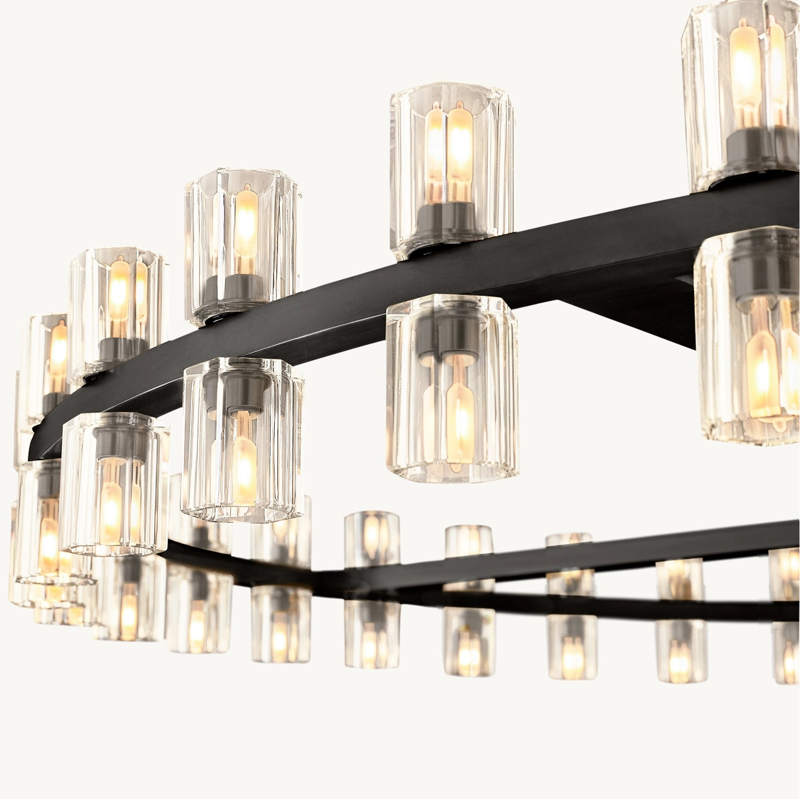 La collection Rouage s’inspire des engrenages industriels et de leurs proportions méticuleuses. Les rayons, sous forme de hexagones parfaitement imbriqués, s’entrelacent harmonieusement avec des éléments arrondis en cristal. Le tout repose sur une structure métallique solide, créant un jeu de lumière unique et dynamique qui capte l'œil.
